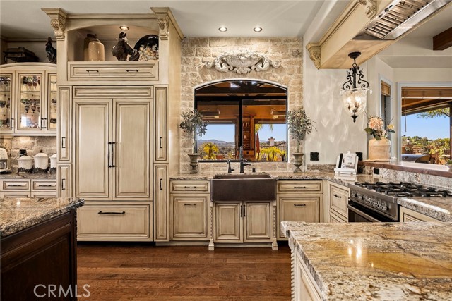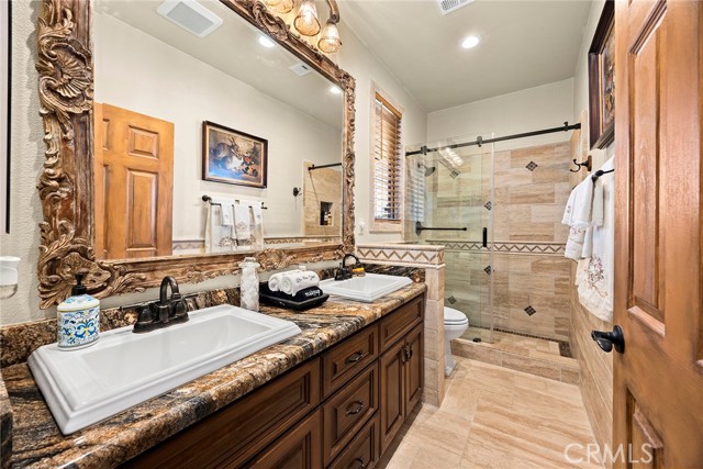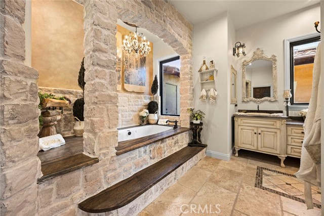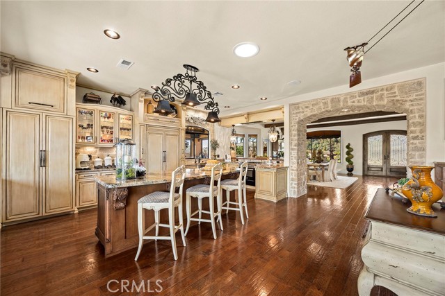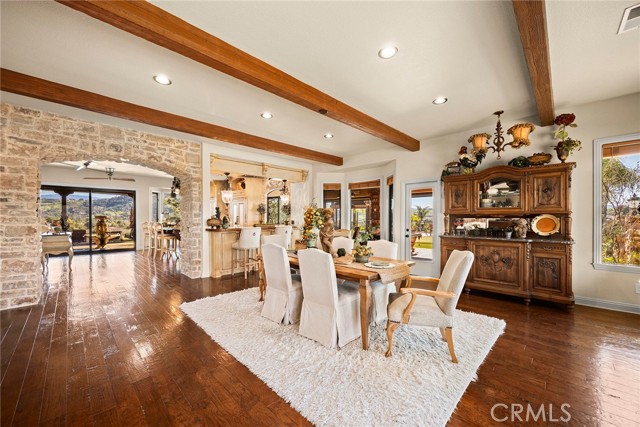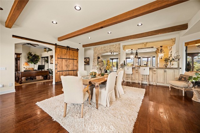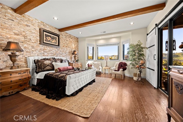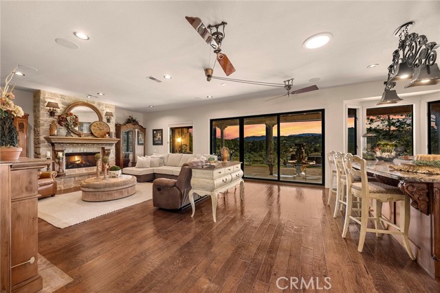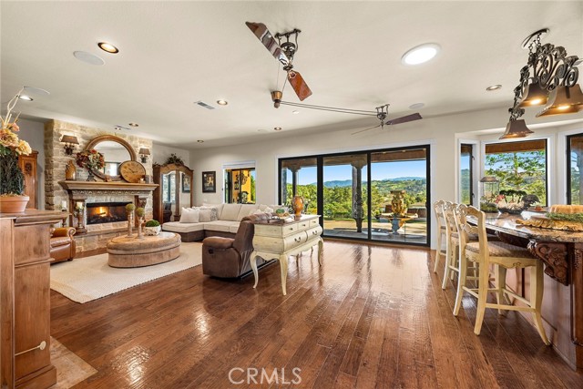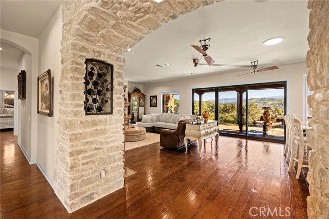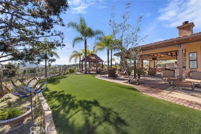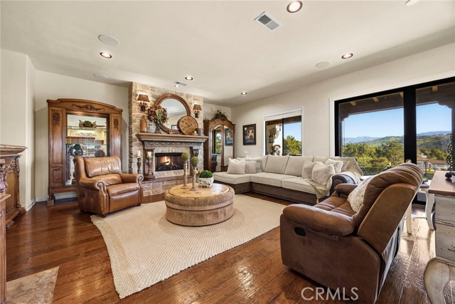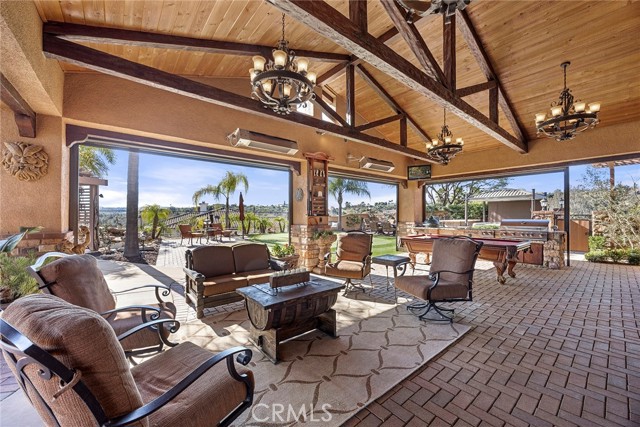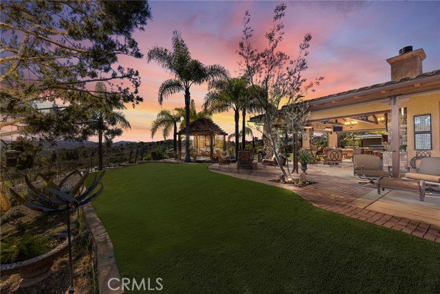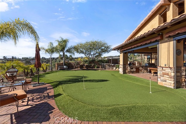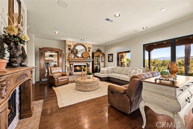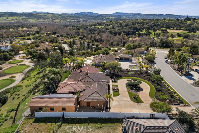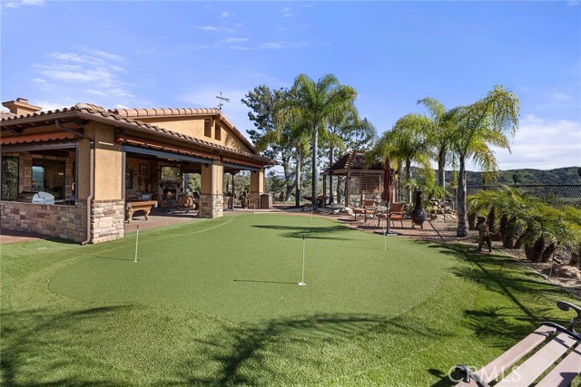 EXCEPTIONAL SEMI-CUSTOM SINGLE-STORY that is breathtaking! Set on an expansive ONE ACRE VIEW LOT the property offers privacy, open space, no HOA'S or Mello Roo's & Located in the Prestigious Sycamore Ranch area on the **6th Tee hole** of the Golf of California golf course. Extraordinary Panoramic Mountain and Valley Views, which are inclusive of some of the most beautiful Sunrise & Sunset Views, (SERENITY)!! Impeccable landscaping with a CIRCULAR DRIVEWAY, & a Four-tiered fountain leading you to a front porch entry. Custom hammered glass 11ft wrought-iron double doors, make a stunning first impression. You enter into the openness of the floor plan, with an office w/custom barn door, Eldorado stoned archway that is complimented w/a custom intricate designed bar. The Family room & kitchen are adjacent & look like they came right out of Architectural magazine. Kitchen upgrades include granite countertops, custom Italian Tuscan cabinetry with rope molding and corbels, hutch, built-in refrigerator, and a Bertazzoni range. Hardwood floors enrich the dining room, family room, kitchen, and office, while the family room features 2 fireplaces w/mantles,1 w/raised hearth adding detailed character & warmth. The dining room & primary bedroom are highlighted by striking stained destressed beamed ceilings. The designed primary suite with a focal point of Eldorado Stone on the wall serves as a private retreat w/separate sitting area & a barn-door-style slider that opens directly to the covered back patio. The Tuscan spa-inspired primary bath features lots of custom designed details a jetted tub, separate shower, dual sinks, makeup vanity, & walk-in closet. The outdoor living experience is truly exceptional. An approximately 840-square-foot Loggia encompasses an 18-foot-high A-framed tongue & groove ceiling & highlights a Tuscan-style outdoor kitchen with BBQ & smoker, fireplace, big-screen TV, surround sound, gas heaters, & fire pit. The outdoor spa area is a destination of its own, featuring a spa with dramatic fire-and-ice elements and an Onyx countertop bar accented with multi-color lighting. The entertainer’s patio is completed by interlocking brick pavers, brick inlayed walkways, brick planters, artificial turf, & a five-hole putting green. Additional highlights include OWNED SOLAR PANELS, & RV parking & a covered RV PORT. A rare opportunity to enjoy resort-style amenities, sweeping views, & timeless comfort in one of the area’s most desirable hillside neighborhoods.