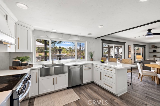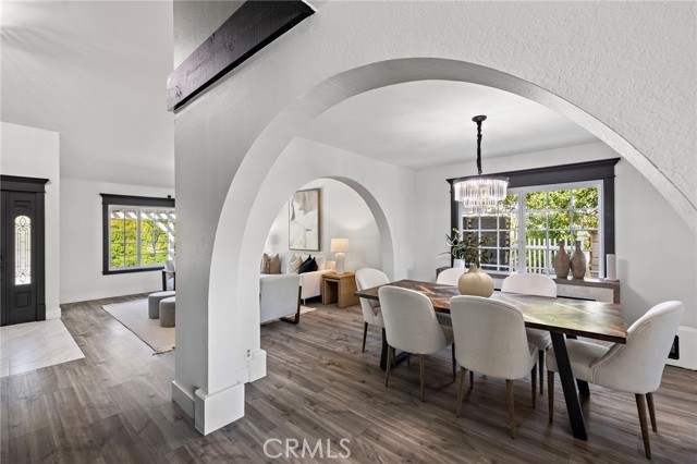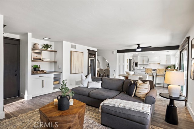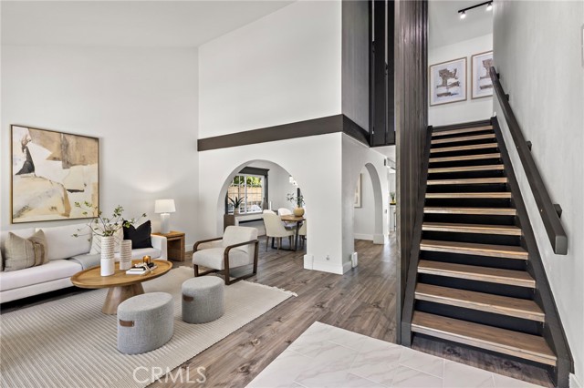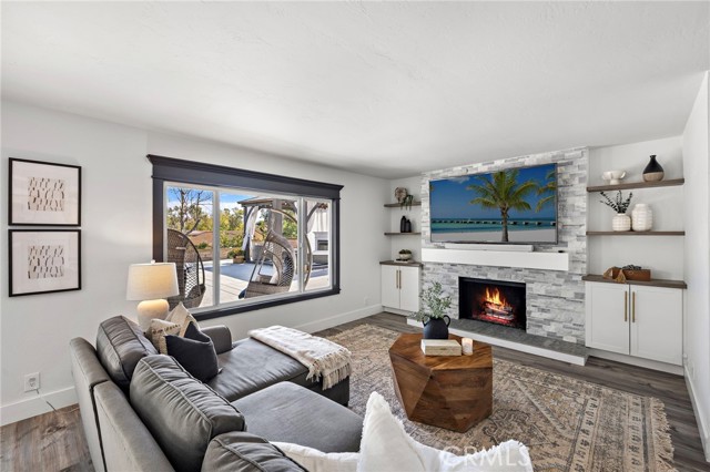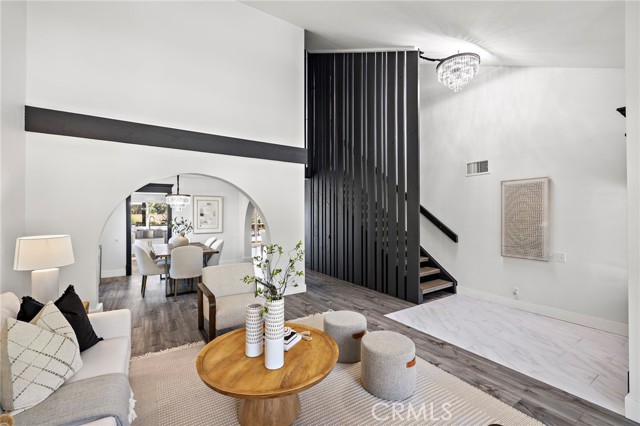 From the moment you arrive, this exceptional four bedroom, three bath residence captivates with a presence that simply feels like the one! The dramatic entry showcases a striking architectural staircase accented by custom wood slats with concealed storage, updated flooring and a statement chandelier that draws the eye upward. The open-concept living and dining areas, designed to maximize natural light, flow effortlessly from the foyer and are highlighted by a beautifully refreshed fireplace with custom built-in cabinetry and shelving, complemented by updated flooring—ideal for both everyday living and refined entertaining.