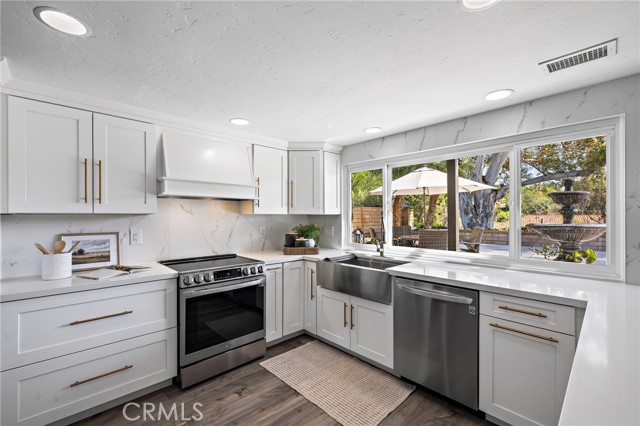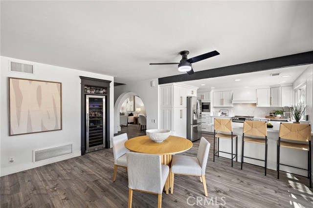 The kitchen has been completely reimagined with new custom cabinetry, quartz countertops, stainless steel appliances, designer backsplash, upgraded fixtures, and new flooring, offering the perfect balance of style and functionality. A custom wine storage area with wine refrigerator and glass display nook adds a sophisticated touch, perfect for hosting.