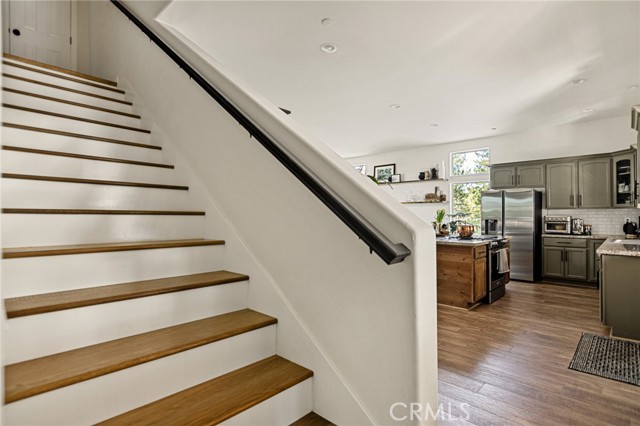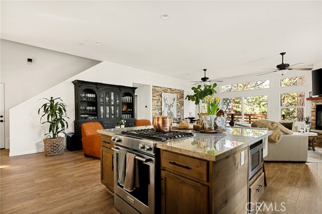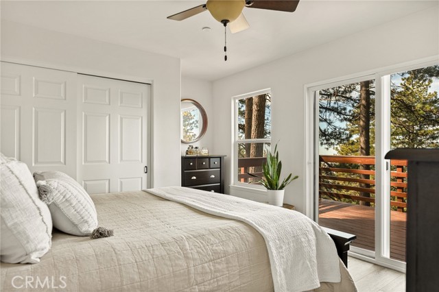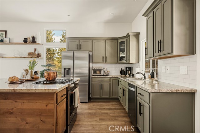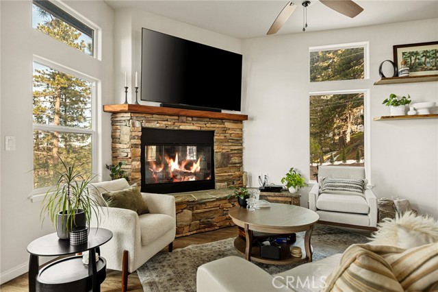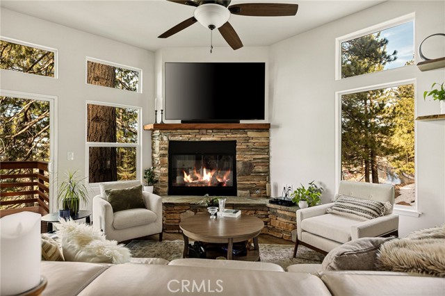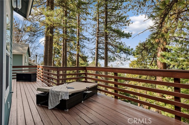 SPECTACULAR MODERN MOUNTAIN HOME! Welcome to this immaculate 3-bedroom, 2-bath home offering a breathtaking sunset & city lights view and exceptional pride of ownership throughout. Whether you’re seeking a full-time residence or a serene vacation getaway, this beautifully maintained property delivers comfort, functionality, and unforgettable surroundings. Located close to Hwy 330 making a daily commute down the mountain a breeze. The home comes equipped with central heating, air conditioning, fully sprinklered fire protection system, tankless water heater and an attic fan. Upgrades include LVP flooring, ceiling fans, stacked stone fireplace, wood tread staircase and stainless steel appliances. Step inside to soaring 10-foot ceilings surrounded by windows that create natural light with an open, airy ambiance. The kitchen features an oversized island with a beautiful granite counter top and a downdraft range and oven along with Kraftmaid cabinets with self-closing drawers and doors. The MAIN-FLOOR PRIMARY BR offers convenience and privacy, with direct access to the spacious deck—perfect for enjoying morning coffee or evening sunsets overlooking the twinkling lights below. Upstairs, you’ll find two additional bedrooms connected by a Jack & Jill bathroom, along with a versatile loft area currently used as a home office—ideal for remote work or additional living space. The charming front porch adds warmth and curb appeal, while the large rear deck expands your living space outdoors. Inside laundry enhances everyday ease, and the attached two-car garage provides convenience and security. Rare for the mountain area, this property offers ample parking along with generous under-house storage—perfect for seasonal items and outdoor gear. The upgraded landscape design is as thoughtfully cared for as the home itself. Turnkey, exceptionally maintained, and designed for both everyday living and peaceful escapes—this is modern mountain living at its finest. Just minutes from Lake Arrowhead, Big Bear, Snow Valley Ski Resort, and hiking trails, this move-in ready property is perfect as a full-time home, vacation escape, or rental investment. Enjoy the quaint town of Running Springs with its markets, restaurants, shops, post office and library. Schedule your showing today and experience mountain living at its best!