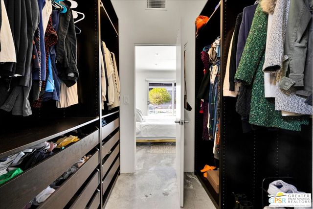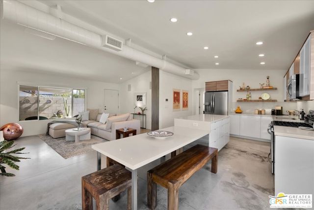 Striking 3BD/2BA industrial-modern residence offering 1,222 sq ft of thoughtfully designed living space, where a cohesive palette of steel, glass, stainless steel, and cinderblock carries seamlessly through both the interior and exterior. The home welcomes you with a private front patio and aloe garden, leading into interiors featuring finished exposed concrete floors, high ceilings, and exposed ductwork for a bold architectural feel. Custom built-in shelving anchors the living area, while a central surround sound system throughout the home enhances everyday living. The kitchen is a standout with a large quartz island, new cabinetry, stainless steel appliances, recessed lighting, and ample storage. One guest bedroom includes built-in desk space, while the third bedroom is currently used as a home office; blackout shades are installed in all bedrooms. The primary suite features sliding glass doors to a private seating patio, a walk-through closet, and a spa-style walk-in shower. The guest bath includes a walk-in shower, modern vanity, and in-unit laundry. Outdoor living is exceptional with a saltwater pool and spa, natural gas fire pit, bocce court, built-in outdoor grill, private outdoor shower, raised garden boxes, mature fruit trees, and flexible space that may accommodate RV parking. The home was recently updated with an emphasis on design and performance and includes an owned solar electric system with 16 panels, a 200-amp electrical panel, high-efficiency HVAC, and double-pane energy-efficient doors and windows with custom shades. Four additional solar panels, previously used for solar water heating, along with a whole-house evaporative cooler, have been disconnected by the current owner but remain in place should a future owner wish to utilize them. Additional features include ample storage and a ventilated two-car garage. A rare opportunity to own a design-forward, energy-efficient home with exceptional indoor-outdoor living in Palm Springs.