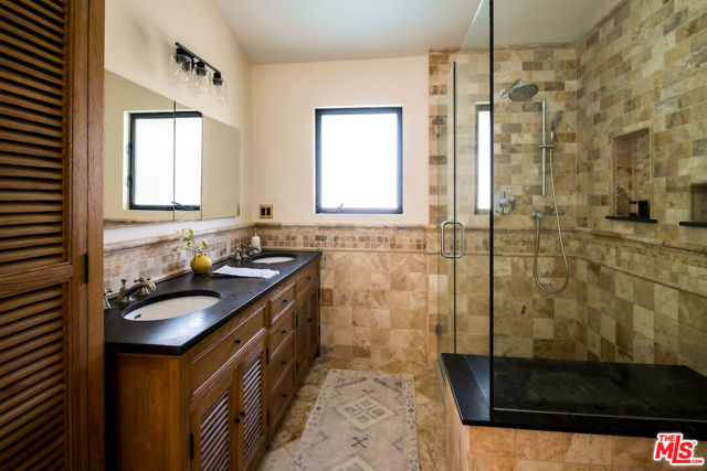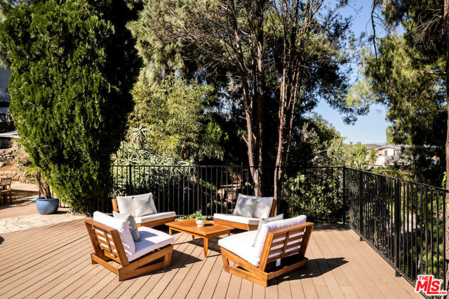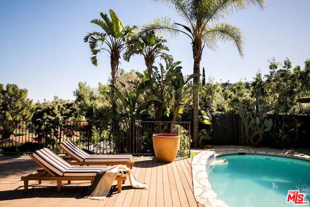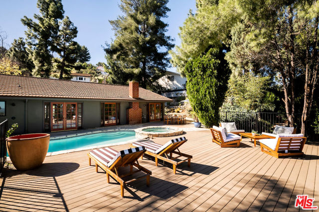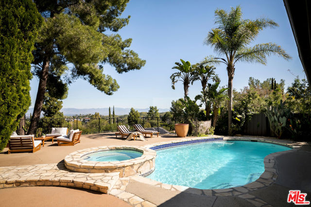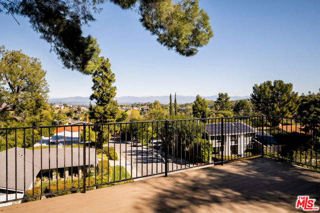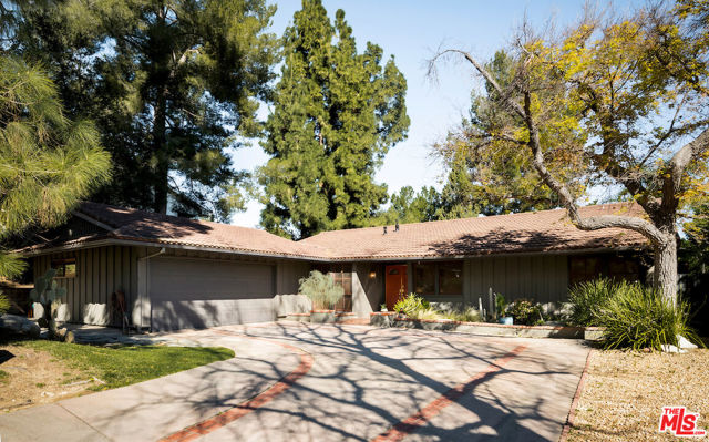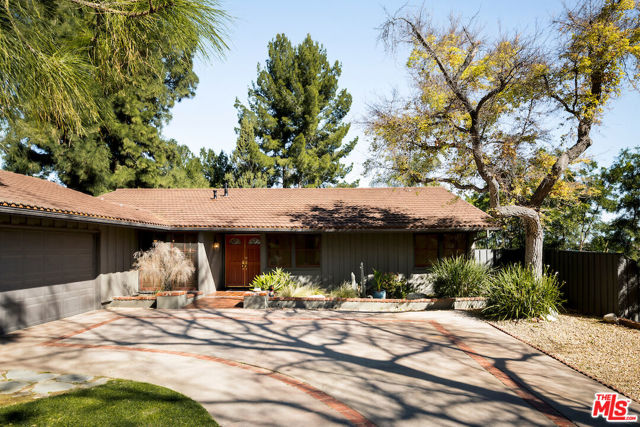 Nestled in a quiet cul-de-sac street in an upscale neighborhood of Woodland Hills, adjacent to Topanga Canyon, this charming single-story ranch offers privacy, space, and sweeping valley views. This beautifully maintained 3-bedroom home features a thoughtful, open layout designed for both everyday living and effortless entertaining. The spacious kitchen with gorgeous Brazilian Quartz countertops offers eating at the island or dining in the attached dining room making entertaining a dream. Head to the living room with French doors that open to an expansive backyard seamlessly blending indoor and outdoor living while showcasing breathtaking panoramic views. The spacious primary suite is a true retreat, complete with French doors leading directly to the serene pool deck, a wall of closets, and an en-suite bath appointed with travertine tile and striking black stone countertops. Two additional light-filled bedrooms share a bright full bathroom. In addition to the main living areas, the partially converted garage provides flexible bonus space plus a separate office ideal for today's work-from-home lifestyle. A detached artist's studio tucked below the pool deck offers even more creative or guest potential. (Bonus areas are not included in the square footage.) Set on a generous lot, the property offers multiple outdoor spaces to enjoy: a side yard with a grill conveniently located off the kitchen, a large driveway with ample room for parking or recreation, and an incredible backyard designed for entertaining. Lounge on the expansive deck, relax by the pool and spa, and take in the stunning valley vistas and mountains. Just minutes to scenic hiking trails, Topanga Beach, Calabasas Commons and Westfield Topanga Mall. This is California living at its finest. Plus, great schools in the area! Don't miss your chance to see this special home!