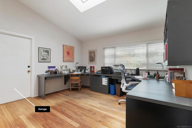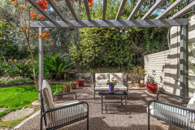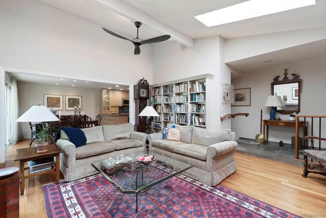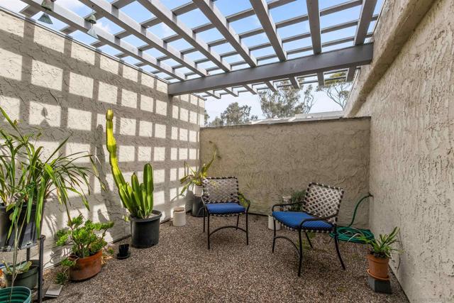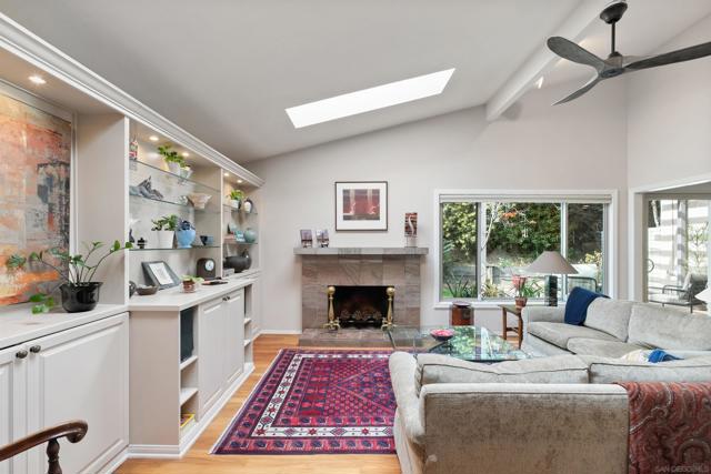 Elegant single-level home in the serene and highly convenient La Jolla Shores Heights community featuring 3 bedrooms, 2 bathrooms, an attached 2-car garage, and beautiful outdoor spaces. This corner unit provides a nice sense of separation from neighbors, excellent sunlight, and a bonus lawn area. The living room is cheery and cozy with vaulted ceilings and skylights, a fireplace, and built-in cabinetry and shelving. The comfortable dining area flows seamlessly to the patio and also to the open-concept kitchen with a peninsula. There is ample workspace in this tastefully updated kitchen! The spacious primary suite enjoys soaring ceilings, an ensuite bathroom with dual vanities and a walk-in shower, and a private patio. Two additional bedrooms are generously sized; one is currently used as a bright home office with skylight, built-ins, and direct garage access. The hall features a coat closet, a buffet/pantry station that serves the kitchen, and a side-by-side laundry closet with shelving. Additional features include an owned solar system, water softener, and one off-street parking space in addition to the garage. La Jolla Shores Heights features walking trails, a tennis court with basketball hoop, a playground, and a pool accompanied by a wading pool, changing rooms, and restrooms. Close proximity to freeway access, UCSD, YMCA, Westfield UTC, highly rated schools, and so much more. This is a wonderful home for life’s many chapters.