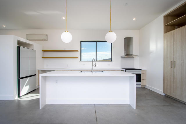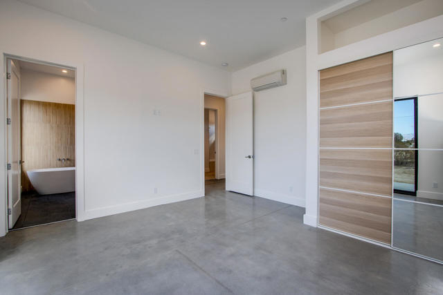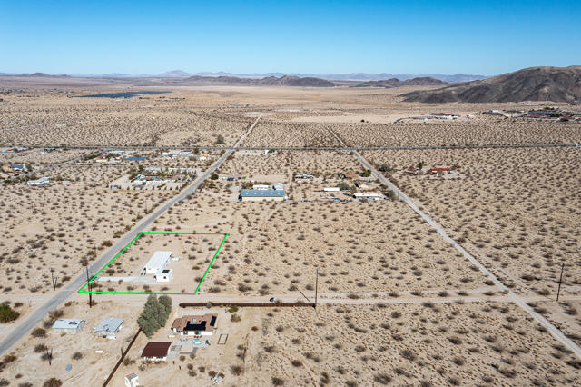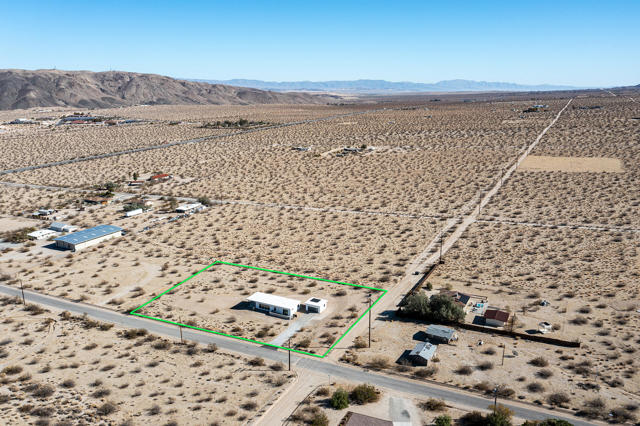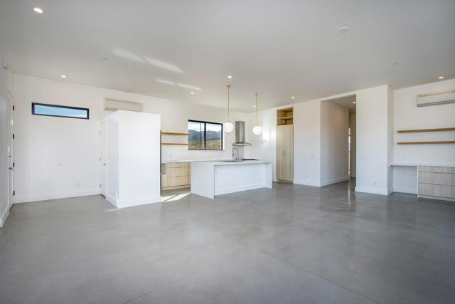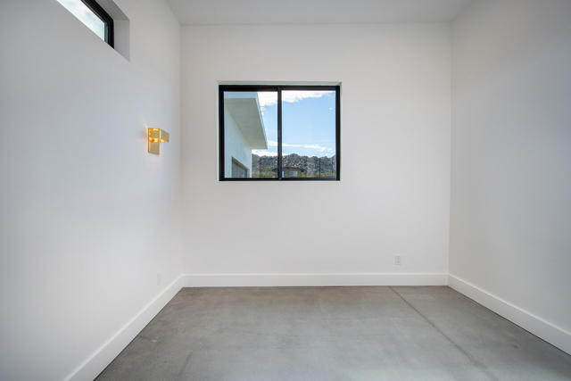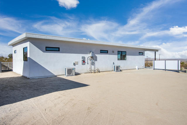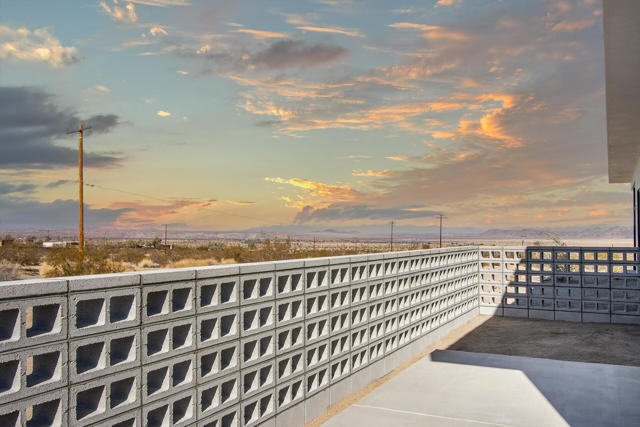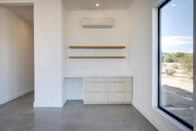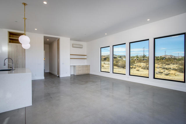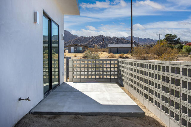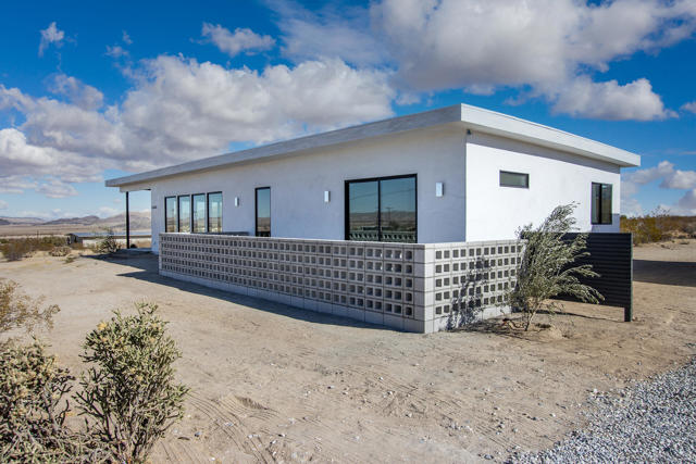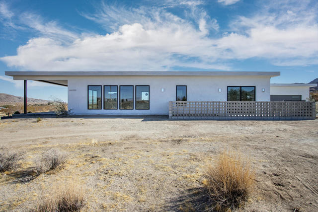 Immaculate new construction perched on a gentle slope in the highly coveted Panorama Heights neighborhood of Joshua Tree. 2 bed 2 bath with high ceilings & expansive windows that bring in beautiful natural light. 1.01 ample acres with desert fauna that offers peace, serenity, & ample space. Property features a finished detached garage with ADU potential & Paid Solar & backup battery! Upgraded sliding glass doors open to an oversized covered patio. Inside you'll find a beautiful island style kitchen with stainless steel new appliances, pendant globe lighting, breakfast bar, long counters, shelves, with generous cupboards & cabinets. Main bedroom enjoys a wide closet with a loft shelf. Main bath adorned with upgraded cladding, tile floors, glass wall & raindrop shower with a contemporary freestanding bathtub. Separate laundry area with new washer/dryer. Hallway bathroom with raindrop shower head, hexagon mosaic tile, bathtub, & sleek floating vanity with vessel sink. Property also features upgraded concrete work & block wall. Located just a half mile to a newly open trendy coffee & cocktail lounge. Perfectly located to tour Indian Cove for hiking, & the Joshua Tree National Monument where about 3 million tourists visit annually. 2 miles to Copper Mtn College. Organic cafes, restaurants, & the JT Saloon in the nearby Joshua Tree Village. 40 miles to Palm Springs. 133 miles to LA. Must see for a primary residence, rental, and investment!