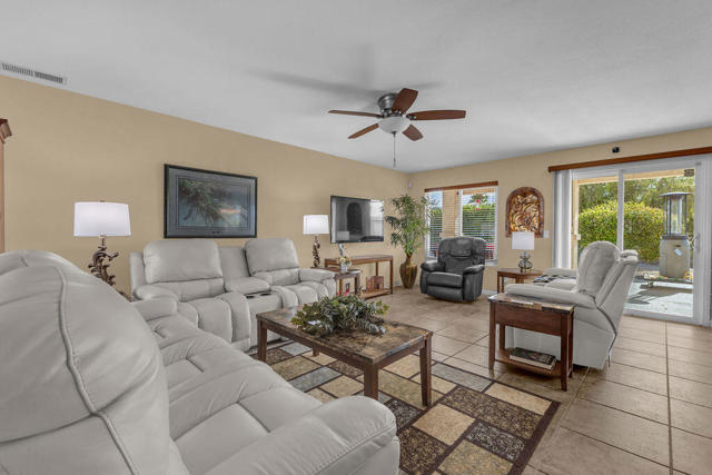 Welcome to easy desert living in the highly sought-after Mission Lakes Country Club community! This beautifully maintained 2 bedroom, 2 bathroom home offers 1,568 sq. ft. of comfortable, open living space designed for both relaxing and entertaining.Step inside to a spacious kitchen perfect for gathering, and a stunning rock fireplace that creates a warm focal point in the living area. The home also features a stylish bar area complete with a wine fridge, making it easy to host friends and family. Double-pane windows provide year-round comfort and energy efficiency.Outside, enjoy a manicured backyard with breathtaking views and a covered patio ideal for morning coffee or evening sunsets. The 2-car garage plus separate golf cart garage adds convenience and extra storage.Golf for two on title is included, offering exceptional value and access to the lifestyle Mission Lakes is known for. Lovingly and seasonally used for the past 13 years, this home reflects true pride of ownership and is in excellent condition.Don't miss your opportunity to own a slice of resort-style living in Mission Lakes Country Club.