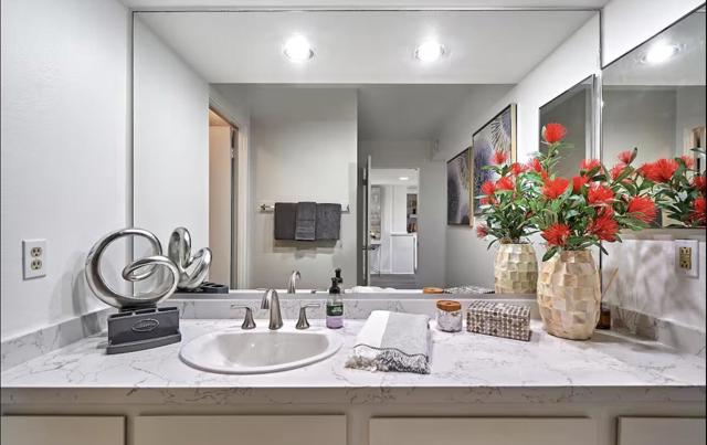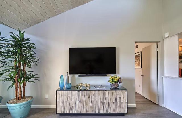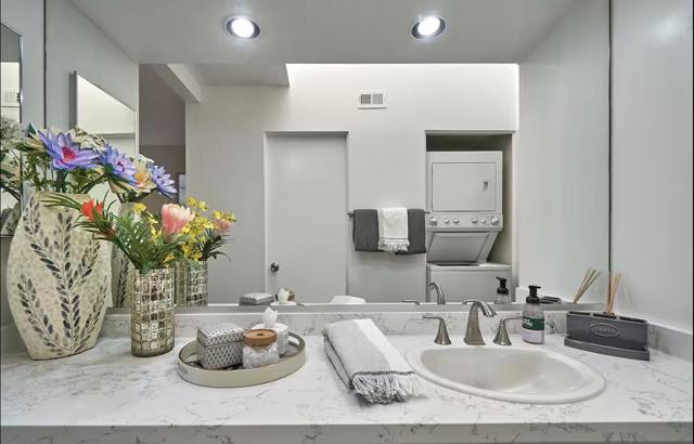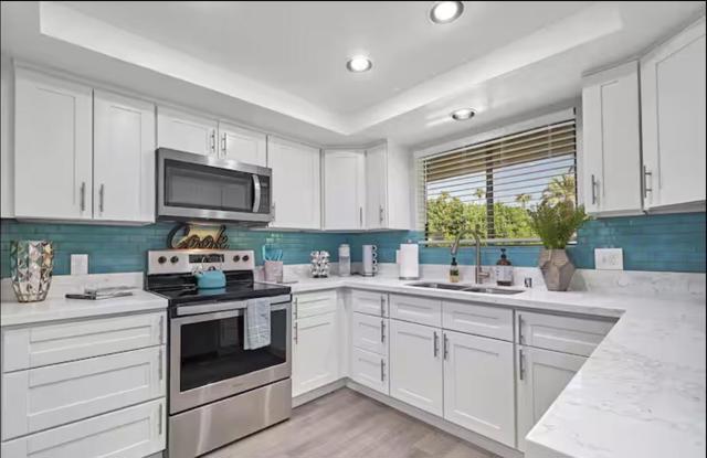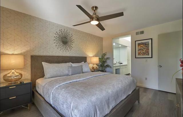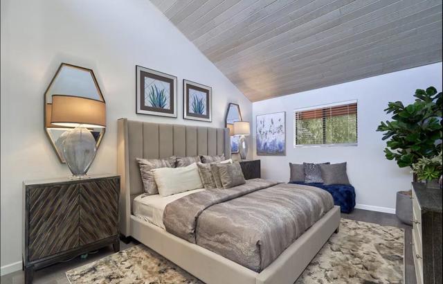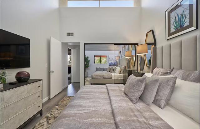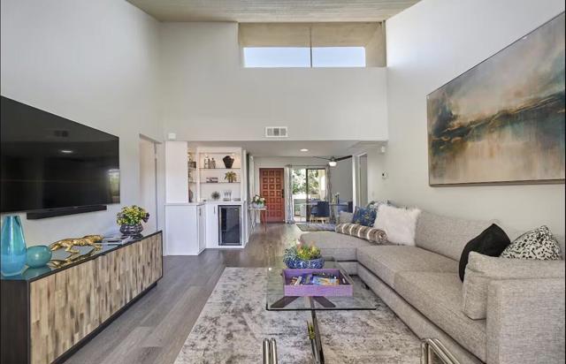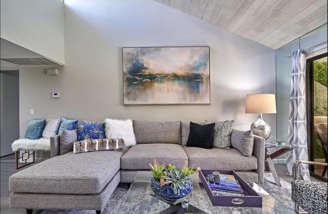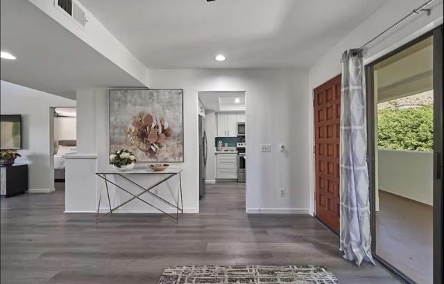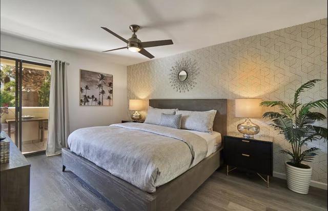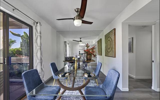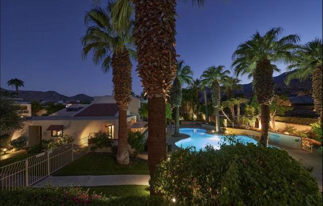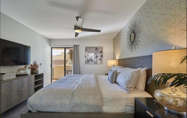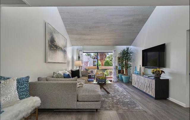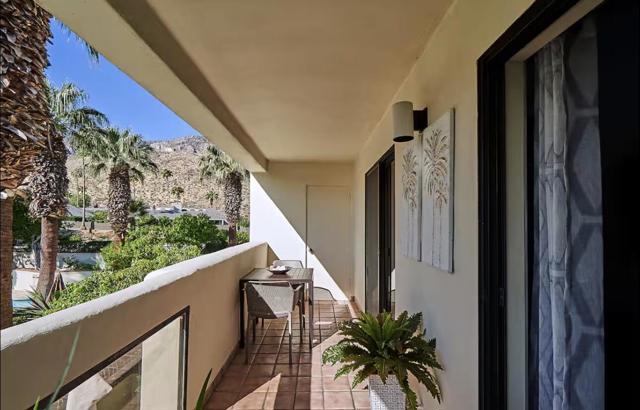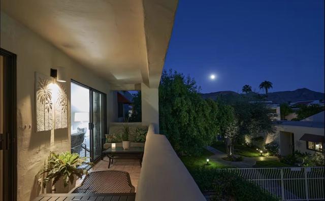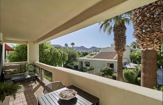 Turnkey move-in ready with excellent income potential! This beautifully remodeled top-floor condo boasts a strong Airbnb track record, commanding up to $4,400 per month in season. Located in the gated Canyon Granada community in the desirable South Palm Springs area, this light-filled 2-bed, 2-bath home offers single-level living with vaulted wood ceilings, clerestory windows, and an open layout that opens to a newly updated private deck overlooking the pool and mountains. Enjoy stunning mountain views from the living room, plus a front entry deck off the dining area with picturesque mesa views.The thoughtfully designed layout places the guest bedroom on the opposite side from the master suite for added privacy, and both bedrooms feature en-suite baths. The master suite includes a walk-in closet and in-unit laundry. The updated kitchen showcases stone countertops, stainless steel appliances, white Shaker cabinetry, and a designer tile backsplash.Surrounded by lush citrus trees, mature landscaping, and mountain views, the community offers pools, spas, tennis courts, and covered parking with storage. Ideally located close to hiking trails, Smoke Tree Village shopping, and dining. Fee simple land with no land lease; HOA dues include water, trash, exterior building maintenance, and grounds.
