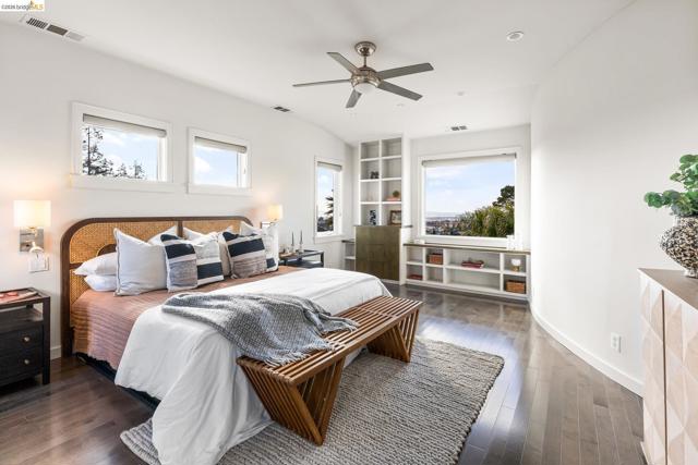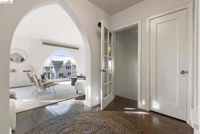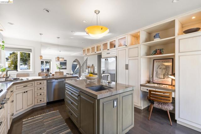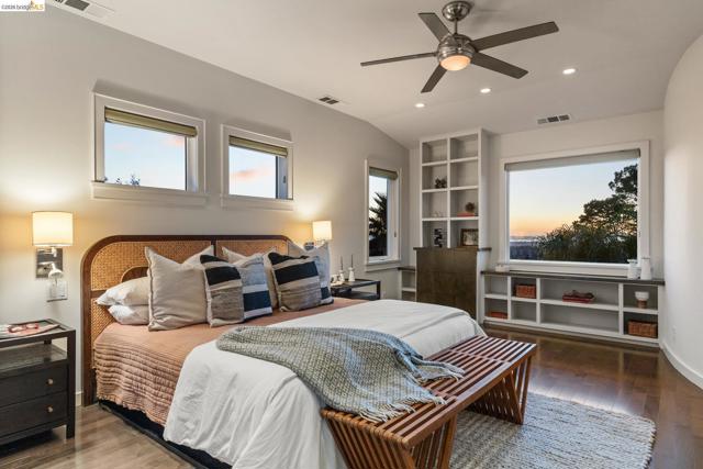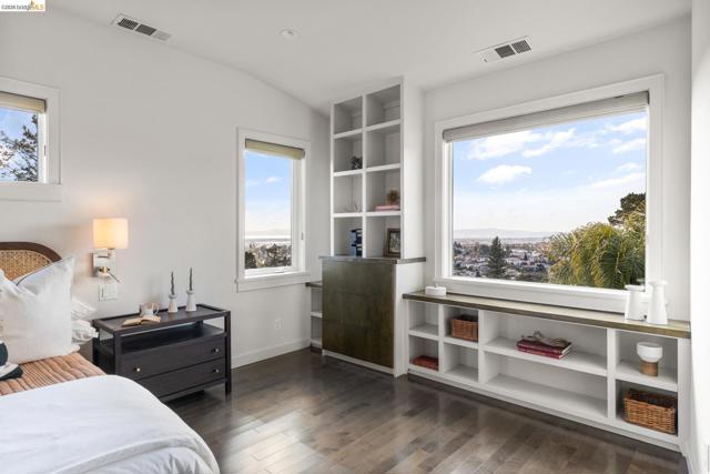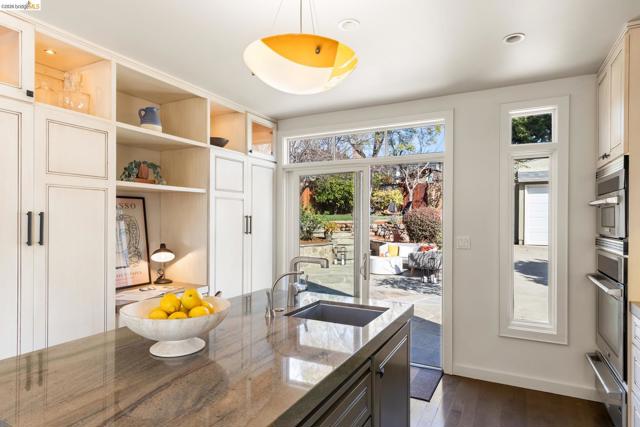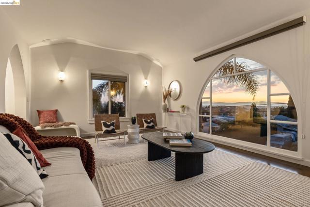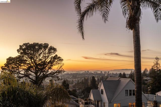 Beautifully remodeled and expanded in 2008, this designer home with Bay views is a true stand out home. Blending classic architecture with modern design, this special residence features rich wood floors, soaring ceilings, a fireplace in living room, and an open dining area flowing into a chef’s kitchen, ideal for entertaining. Light and airy, the kitchen includes an oversized island, stone counters, premium appliances, and peninsula bar seating. Sliding doors create seamless indoor-outdoor living to a remarkable, park-like backyard with hardscaped patio, grassy area, fruit trees and garden beds. The main level of the home offers two spacious bedrooms, including one ensuite. The upper level is dedicated to a luxurious primary retreat with stunning views, walk-in closet and spa-like bath with a secondary washer/dryer. On the lower-level find a charming guest suite - with both interior and exterior access - which boasts views, a bathroom and kitchenette creating exceptional flexibility. Convenient, long driveway with almost level in entry from back of home. Detached 2 car garage, solar panels and many system upgrades! Minutes to top rated Redwood Heights Elementary and close to shops, stellar dining, Redwood Regional Park, freeway & transit. What a wonderful place to call home!