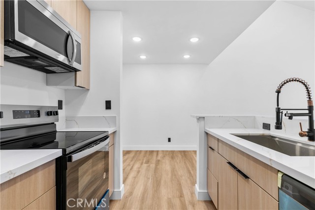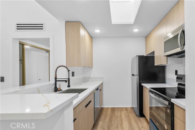 This beautifully remodeled top-floor one-bedroom condominium is nestled in the prestigious Catalina Terrace complex of Monterey Hills, minutes away to LA downtown or Pasadena easy access to 110 Freeway. Highlights include a spacious living room with a sliding glass door leading to a private balcony overlooking the tranquil lush garden and pool area, recessed lighting all over and a modern kitchen with stainless steel appliances and Quarts counters. The master bedroom boasts tall sliding mirrored closets and serene garden and pool views. Additional features include cathedral ceilings in the living room and master bedroom, a kitchen skylight, a generously sized balcony perfect for outdoor seating, central A/C and heating, secured entry, and gated underground parking with two side-by-side spaces. All remodeling including flooring & recessed lights are approved by HOA.