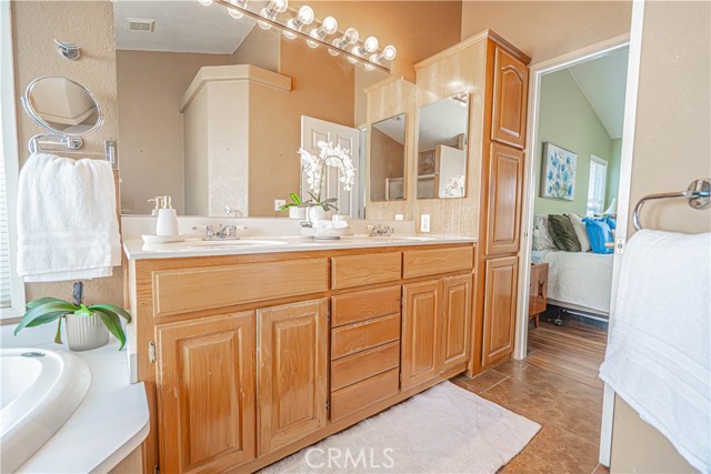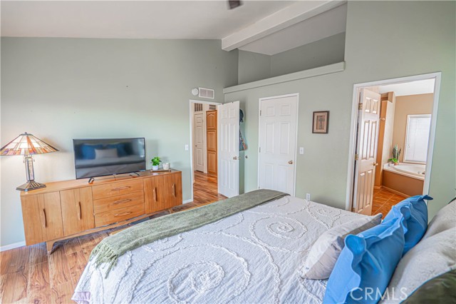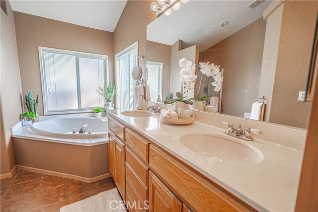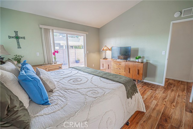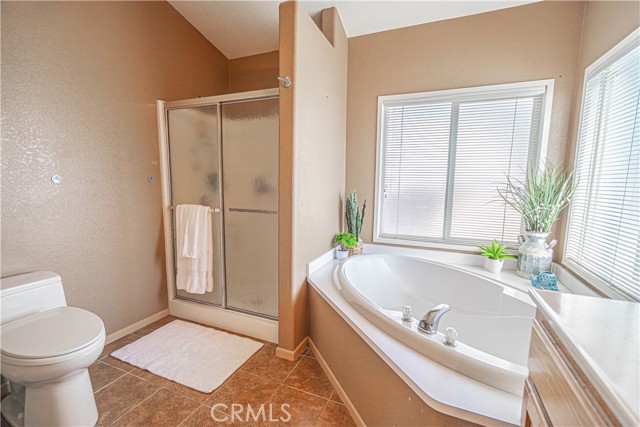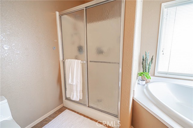 The spacious primary suite includes a walk-in closet and a private ensuite bathroom with a step-in shower, double vanity, soaking tub, and a sliding glass door leading directly to the backyard. Additional highlights include a dedicated laundry room with generous storage cabinetry.