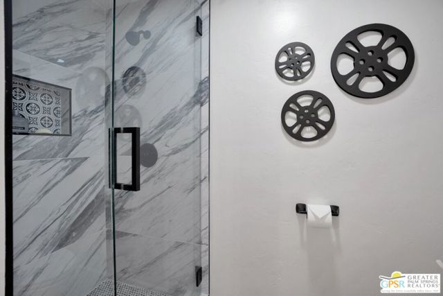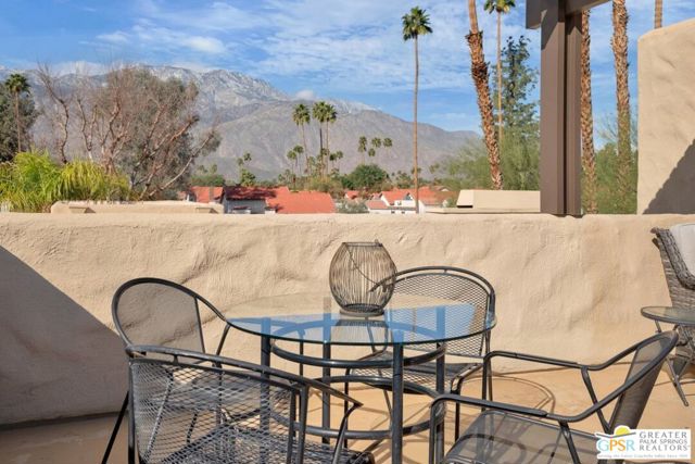 Experience resort-style living in the South Palm Springs community of Waverly Park, ideally situated on fee simple land. Step inside to find elegant porcelain tile flooring spanning the entire first floor, complemented by a stunning wooden staircase leading to the upper level. The inviting living area showcases a stacked stone gas fireplace, creating a warm focal point for relaxing evenings. Enjoy seamless indoor-outdoor living with a large, private enclosed courtyard off the living areas. The kitchen is both stylish and functional, featuring two-tone cabinetry, granite countertops, a ceramic tile backsplash, stainless steel appliances and a single-basin stainless steel sink. The spacious downstairs bedroom features an en-suite bathroom that has been completely remodeled with custom cabinetry, quartz countertops, shiplap accent backsplash, and frameless shower door with custom ceramic tile enclosure. Upstairs, the expansive primary bedroom features luxury vinyl flooring for a warm and modern touch. The primary bath has also been tastefully updated and features quartz countertops, a frameless shower door, a large soaking tub, and elegant ceramic tile finishes. The rooftop patio off the primary suite offers an additional private outdoor retreat featuring stunning San Jacinto Mountain views. Additional highlights include direct access to a two-car garage with insulated garage door panels, gas or electric dryer hookups, and newer window treatments throughout. Residents enjoy outstanding community amenities including two tennis courts, two pickleball courts, three pools, and three hot tubs. HOA dues cover water and trash, exterior stucco and roof maintenance, as well as upkeep of the common areas.