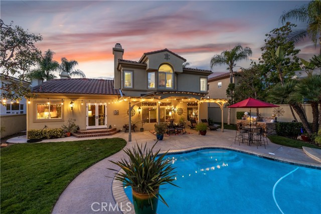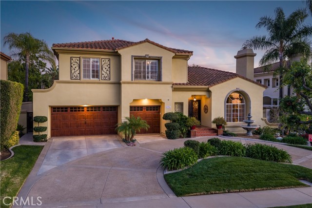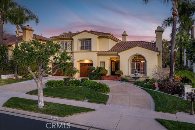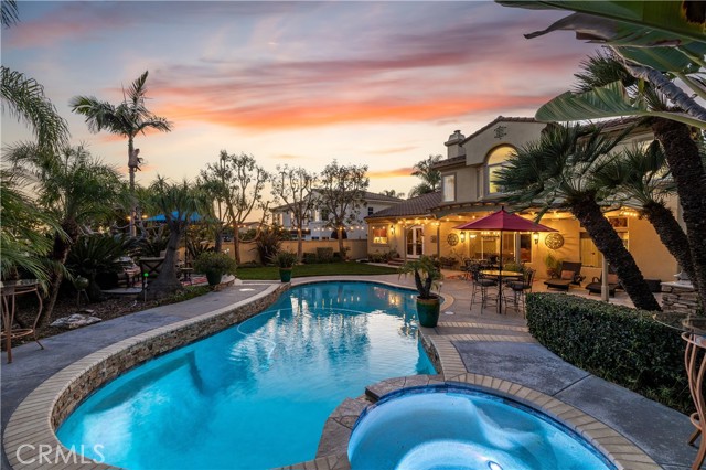 Situated on a premier point lot within the gated La Verne Heights community, this residence pairs sweeping Los Angeles city lights views from the front yard with resort-caliber outdoor living and refined interiors. A circular concrete driveway sets an impressive approach, framed by manicured landscaping and mature palms. The covered entry showcases terracotta style concrete tile with decorative risers, leading to wrought iron and glass double doors beneath a classic tile roof. The entry opens to a spacious living room where terracotta flooring continues, creating architectrual continuity. A fireplace with a substantial mantel anchors the space, while an arched picture window frames views of the hills and city lights. Wrought iron railings define the sunken seating area, and the adjacent formal dining room features large windows and a central chandelier in a cohesive entertaining layout. The kitchen is appointed with custom wood cabinetry, granite countertops, and a large center island with bar seating. A Sub-Zero refrigerator, wine fridge, double ovens, gas cooktop, stainless appliances, and tile backsplash complete the space. French doors open to the backyard, reinforcing indoor-outdoor flow. The adjoining family room offers a brick fireplace with raised hearth, a built-in media center, recessed lighting, and spanning windows to the yard. A downstairs bedroom also functions well as an office. The updated bath includes a glass-enclosed walk-in shower, mosaic flooring, vessel sink, and contemporary fixtures. A laundry room features a utility sink with granite counter, upper cabinetry, and exterior access. Upstairs, a custom staircase with terracotta treads and patterned risers leads to a spacious loft area with built-ins. Double doors open to the primary suite with an arched window and sitting area. The remodeled bath features a freestanding tub, glass-enclosed shower, wood-look tile flooring, dual-sink vanity with stone counters, and a walk-in closet with organizers. Two additional bedrooms share a remodeled hall bath with dual sinks, stone countertops, statement patterned tile flooring, and a glass-enclosed shower. The backyard delivers resort-caliber living, anchored by a pebble-finish pool and raised spa with natural stone accents. Expansive hardscape creates multiple entertaining areas, while a covered patio extends the living space outdoors. A built-in BBQ, dedicated fire pit lounge, manicured lawn, and mature tropical landscaping. The roof is new.