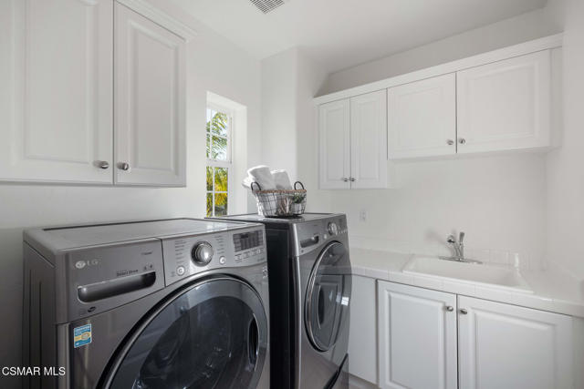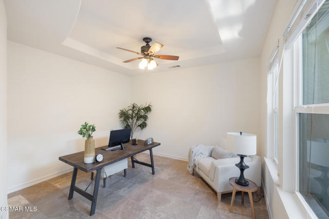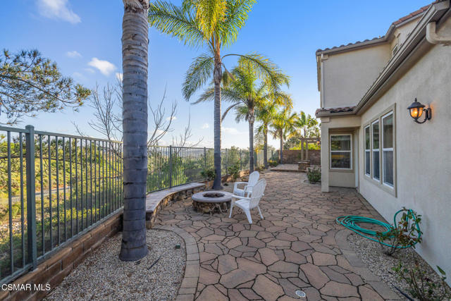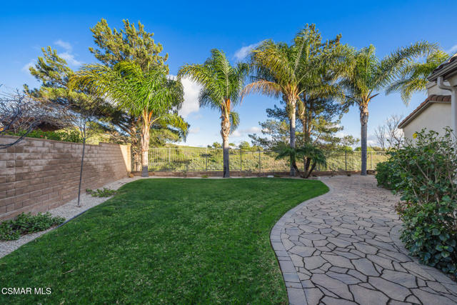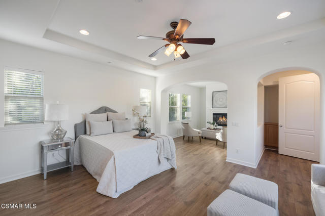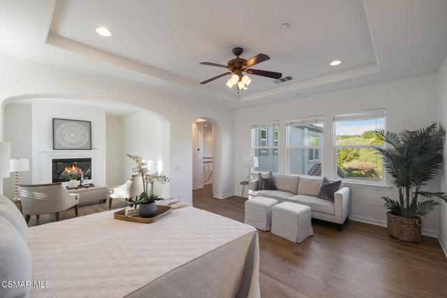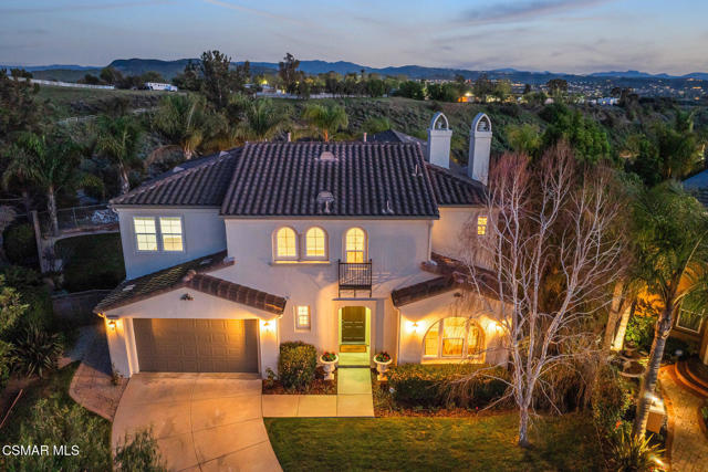 This exceptional home offers over 4,200 square feet, 5 bedrooms, each with en-suite bathrooms, with one located conveniently downstairs, an incredible floor plan with a paver-enhanced backyard made for entertaining or relaxing in the prestigious gated community of Meridian Hills.This beautifully maintained residence sits at the end of a quiet cul-de-sac, capturing stunning mountain and sunset views. Offering 5 bedrooms, 5.5 baths, a spacious loft and a private office, the home spans over 4,200 square feet of thoughtfully designed living space.A dramatic entry welcomes you with a sweeping staircase, soaring ceilings, recessed lighting and elegant stone flooring throughout the main level. Formal living and dining rooms provide ideal spaces for entertaining, while a charming private courtyard enhances seamless indoor-outdoor living.The chef-inspired kitchen is appointed with premium stainless steel appliances, granite countertops, abundant cabinetry, large island with seating, breakfast nook, walk-in pantry and butler's pantry. The kitchen opens effortlessly to the light-filled family room, highlighted by expansive windows, a cozy gas fireplace, media niche and new ceiling fan.The main level features a full bedroom with en-suite bath, a dedicated office and a powder room--perfect for guests, multigenerational living, or flexible work-from-home needs. Upstairs, a spacious loft offers an additional gathering space, along with a convenient laundry room and three secondary bedrooms.The luxurious primary suite serves as a serene retreat, showcasing beautiful views, a private sitting area with fireplace, a spa-inspired bath with dual vanities, soaking tub, glass-enclosedshower and an oversized walk-in closet.The entertainer's backyard is designed for year-round enjoyment with multiple seating and play areas, custom pavers throughout, a gas fire pit, fruit trees and breathtaking mountain vistas. An outdoor built-in bar complete with sink, refrigerator and freestanding gas BBQ creates the perfect setting for hosting family and friends.Additional highlights include fresh interior and exterior paint, new high-end wood laminate flooring throughout the entire second level, dual-zone HVAC with smart controls, video doorbell and security cameras and a three-car tandem garage.Residents of Meridian Hills enjoy resort-style amenities including a community pool and spa, clubhouse, BBQ area, playground, and tennis courts--all conveniently located near Moorpark Country Club, top-rated schools, parks, dining and shopping.An exceptional opportunity to own in one of Moorpark's most sought-after gated communities.