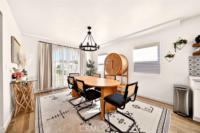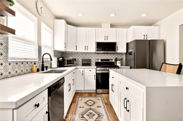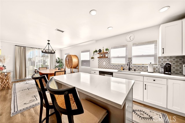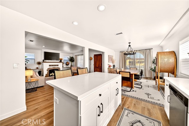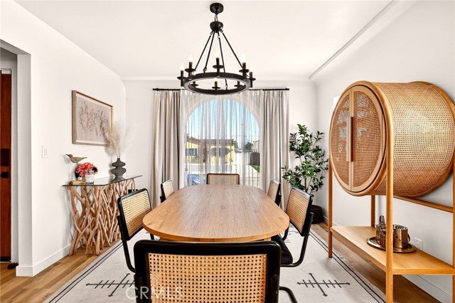 The open-concept layout offers effortless everyday living and an ideal flow for entertaining. Stunning front windows bathe the home in natural light while preserving its authentic architectural charm. The thoughtfully designed kitchen showcases quartz countertops, a center island, deep stainless steel sink, and a 5-burner gas range — both stylish and functional. A charming chandelier anchors the dining space, adding warmth and personality.