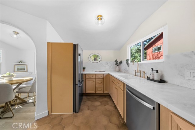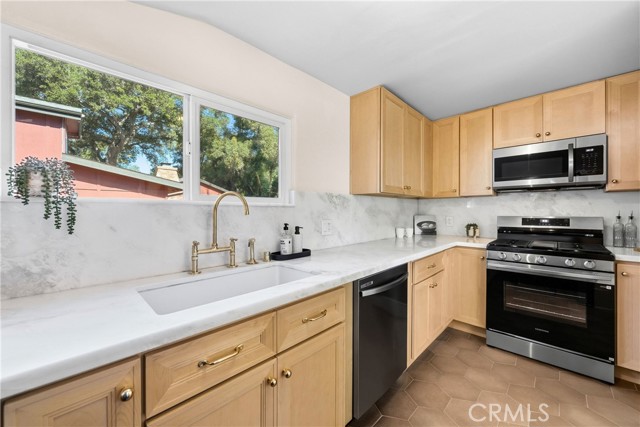 Beautifully remodeled in Meiners Oaks, this 3-bedroom, 2-bath home blends modern upgrades with its original charm on a quiet, tree-lined interior street. The interior feels fresh and cohesive, featuring new Bedrosians laminate flooring throughout and Bedrosians tile in the bathrooms, kitchen, and laundry room. A custom kitchen by Best Sheer Stone anchors the home with clean, contemporary finishes, complemented by new appliances, a stackable washer and dryer, and custom glass shower enclosures—making the home truly turnkey.