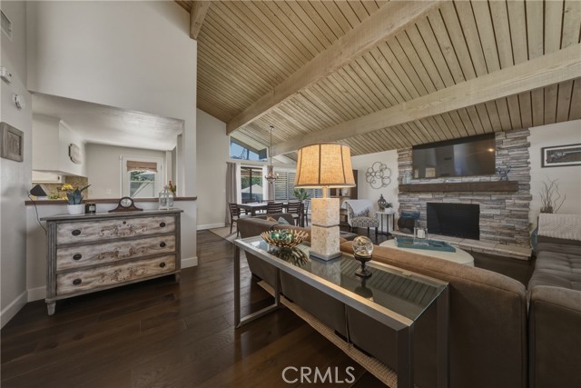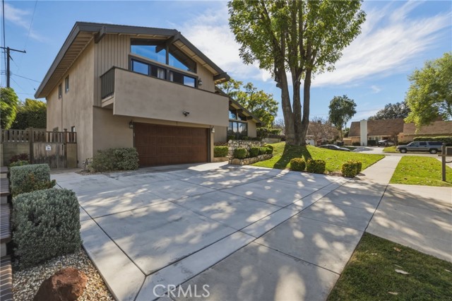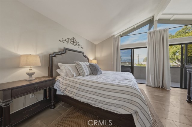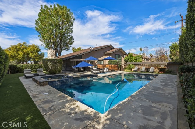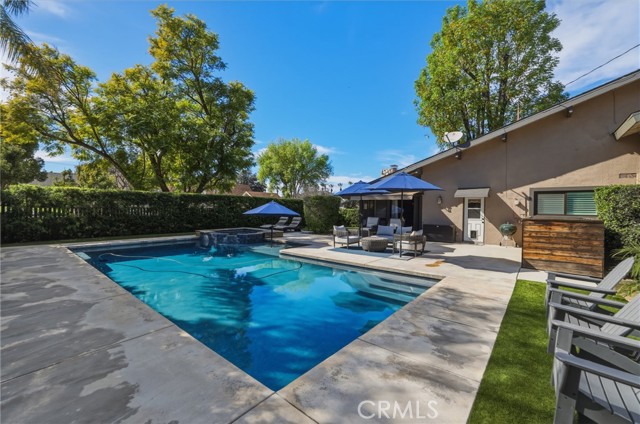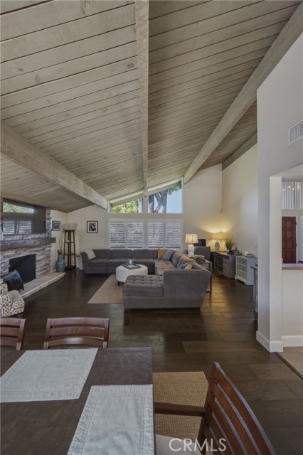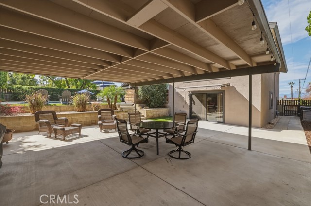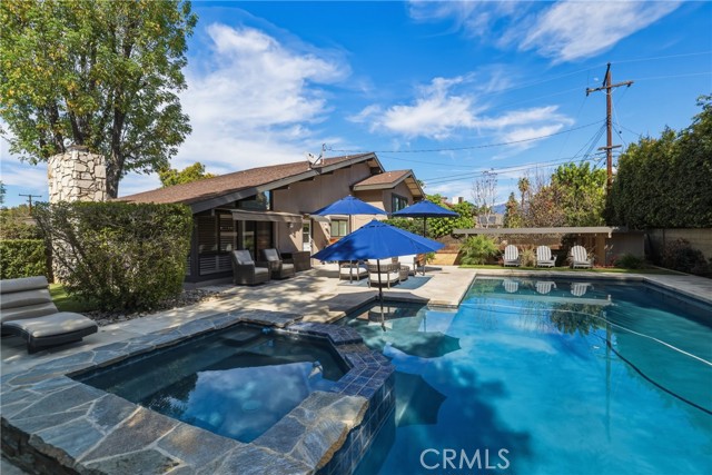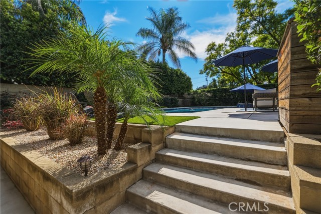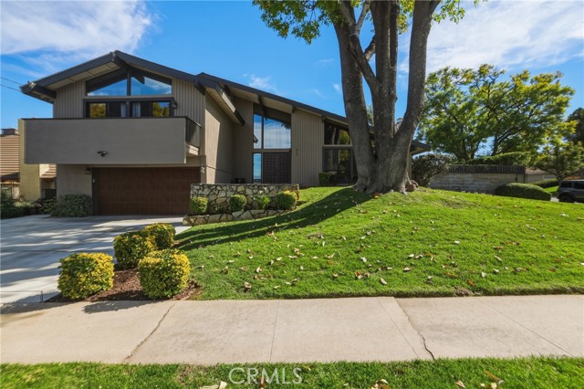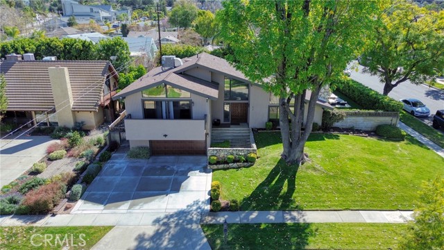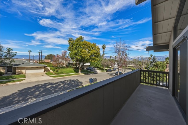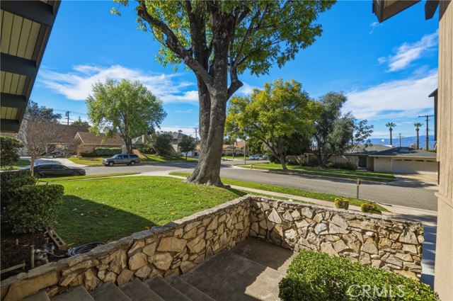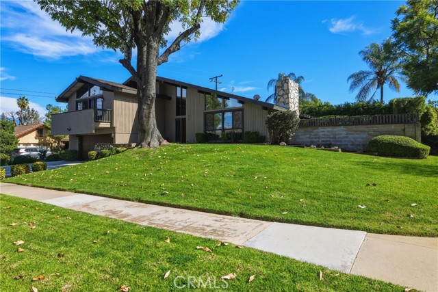 Stunning mid century modern home on a quiet cul de sac in highly desirable South Redlands. Situated on a generous 9,020 square foot lot, this 4 bedroom, 3 full bath residence offers 2,713 square feet of thoughtfully designed living space with sweeping mountain views and abundant natural light. From the moment you arrive, the mature tree lined street and curb appeal set the tone. Inside, dramatic beamed and cathedral ceilings, expansive picture windows, and an open floorplan create a bright, inviting atmosphere. The main level features a grand living room with a striking rock fireplace, a large foyer framed by oversized windows, and direct access to your backyard oasis. The kitchen offers granite counters, generous cabinetry, breakfast bar seating next to a convenient door leading to the pool and outdoor entertaining area. Upstairs you will find three spacious bedrooms, including a primary suite with private sitting balcony, two closets, and an en suite bath with dual sinks, soaking tub, and separate shower. The additional bedrooms are light filled and generously sized. A laundry chute adds charm and functionality. The lower level offers exceptional flexibility with a private oversized bedroom ideal as a second primary suite or guest quarters. It includes a large closet, kitchenette with cabinetry, full bathroom, and a private entrance to the covered patio area and backyard entertainment space, perfect for multi generational living or extended stays. The backyard was reimagined with a beautifully designed pool built in 2018, surrounded by lush landscaping and ample patio space. A shallow lounging area allows for umbrella seating, creating a resort style setting ideal for relaxing or entertaining. Additional highlights include central heat and air, rich wood flooring, tile and carpet, open beam ceilings, multiple living areas, in garage laundry with gas hookups, attached two car garage, and possible RV parking. Located minutes from downtown Redlands near shopping, dining, grocery stores, the University of Redlands, Prospect Park, A.K. Smiley Public Library, scenic trails, and the seasonal charm of Cajon Street festivities. Easy freeway access adds commuter convenience. A true South Redlands gem blending architectural character, comfort, and resort style living.