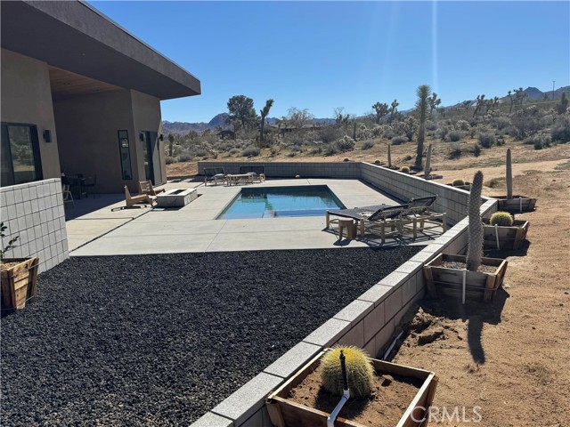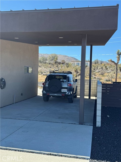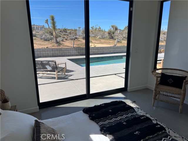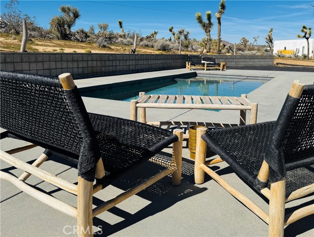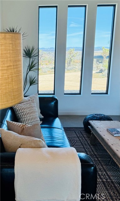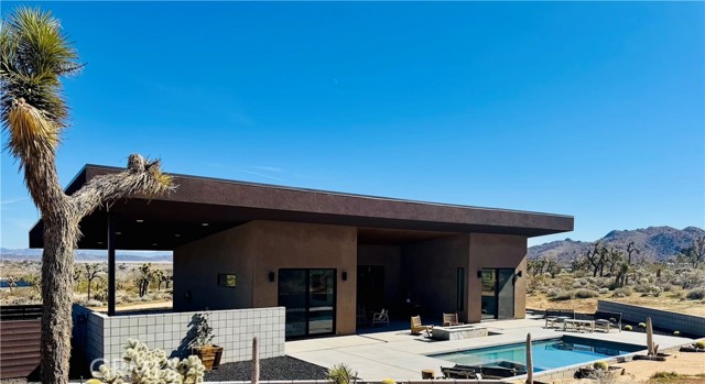Welcome to The Saddle on Saddleback! Another quality collaboration between BluHaus Design Studio and Wilson Construction. Located on a street with million dollar, newly constructed homes, all with unobstructed views of North Joshua Tree and JTNP. Close to Downtown Joshua Tree, the JTNP entrance off Quail Springs, and a short drive to Pioneertown, this centrally located home is ideal as a short term rental or weekend getaway home. Built with a modern, high desert design aesthetic, The Saddle's exterior is bold and pleasing, mixing darker colors with natural stone. The attached carport has an EV charger that can be set to sell charges to guests, if desired. In the backyard, relax around the heated, saltwater pool spa combination while enjoying the tasteful landscaping. After your swim, rinse off in the outdoor shower before lounging on the covered outdoor back deck with fire pit. Once inside, you'll find high end kitchen appliances, a fully wired low voltage platform for a bespoke A/V system, two beautifully designed bathrooms, spacious bedrooms, and endless views from every room. Both bedrooms have sliding glass doors that lead onto the pool deck. This home needs nothing. Furniture available outside of escrow. Schedule a showing of this desirable Joshua Tree home today!