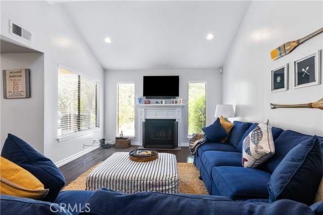 The living room is a showstopper, highlighted by a vaulted ceiling and a wood-burning fireplace with a custom mantle surround. Every window and sliding glass door has tasteful coverings, ensuring privacy and sophistication. Updated recessed lighting and ceiling fans enhance the ambiance throughout the home.