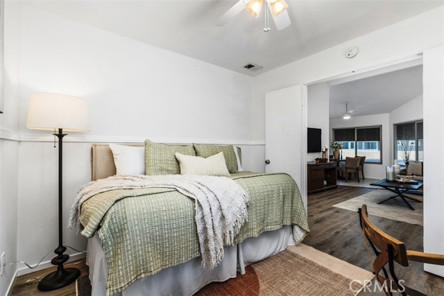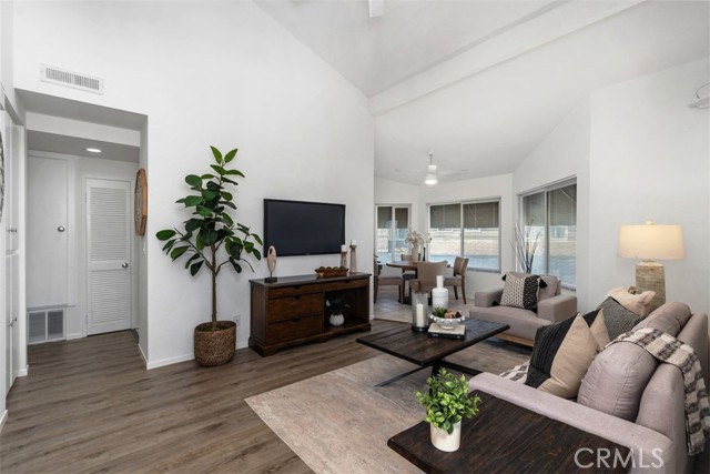 THIS SPACIOUS 843sqft. 1 Bedroom/1 Bath upper unit condo with a Den, is located in the well-maintained gated community of Park Villas. This move-in ready home features an expansive Living Room with vaulted ceilings, brand-new modern flooring in the Living Room, Den, Hallway and Primary bedroom with fresh paint throughout the home. The Den provides the perfect flexible space, ideal for a home office, guest room, yoga/fitness room or craft/hobby room. The galley Kitchen has newer white shaker cabinets, and granite countertops. The Dining Area is filled with lots of bright natural light and is open to the Living Room. The generously sized Primary Bedroom has vaulted ceilings, and a sliding glass door that leads to the private balcony. The Dual-Entry bathroom features a double vanity with a shower-tub combo. This home offers Central Air/Heat, In-Unit Laundry and a 2 Car Detached Garage. There is a community Pool, Spa and Sport court. Nicely located near shops and restaurants.