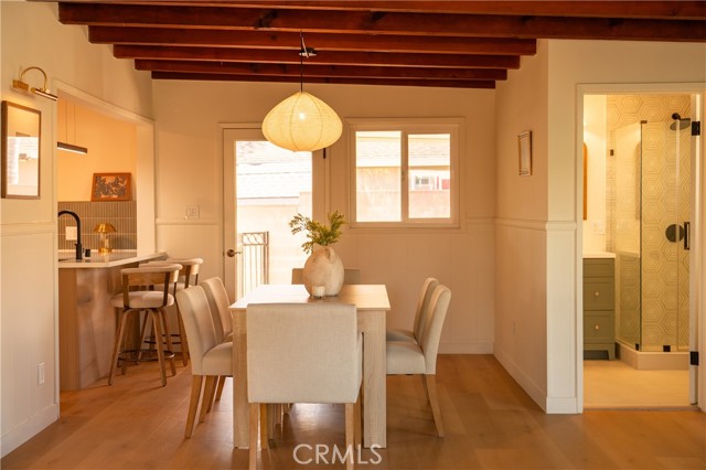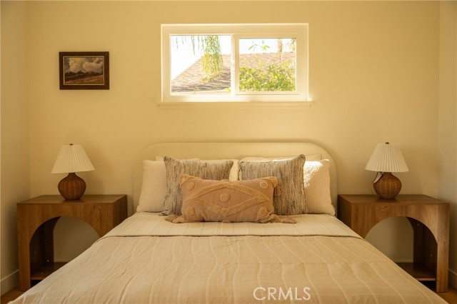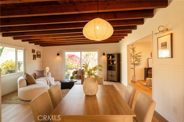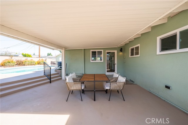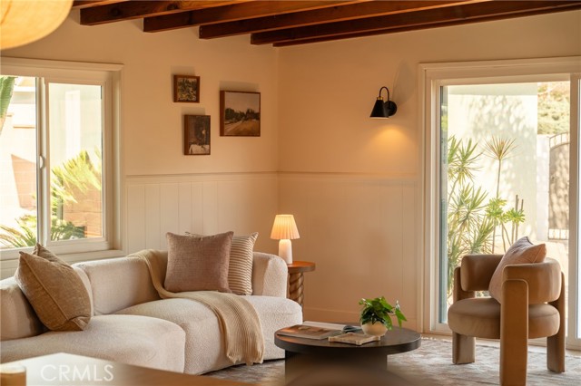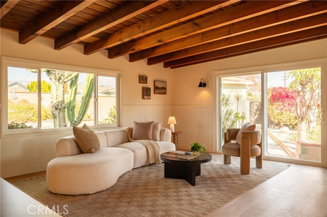 The backyard is a true private retreat. The pool has been newly replastered, and the resort-inspired outdoor setting offers generous patio space, a fire pit area, and multiple seating zones—ideal for entertaining or simply enjoying Southern California living. New dual-pane windows enhance energy efficiency, while the stunning post-and-beam ceilings preserve the home’s authentic Mid-Century character and distinctive architectural appeal.
