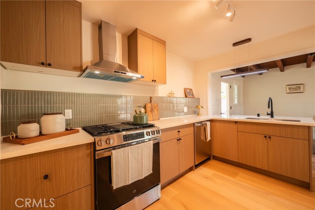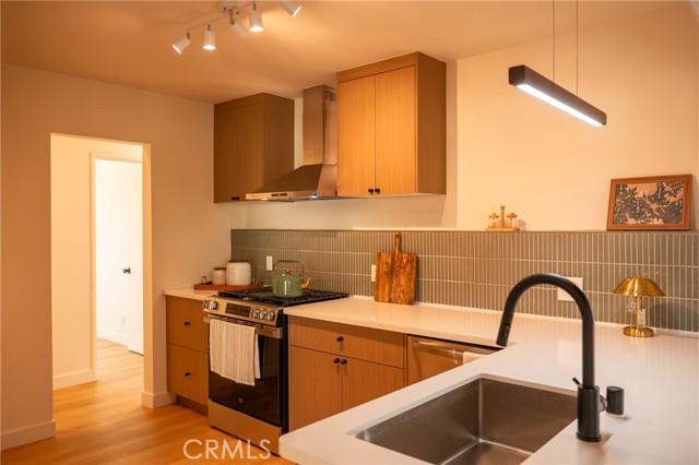 Situated on an expansive 8,000 square foot lot, the property features 3 bedrooms and 2 bathrooms with nearly 1,500 square feet of thoughtfully designed living space. The interior has been tastefully renovated, showcasing a modern kitchen with European-style flat panel cabinetry, designer tile backsplash, and brand-new stainless steel appliances. Updated bathrooms and luxury vinyl flooring throughout create a cohesive, clean, and contemporary feel.