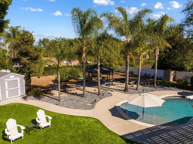 Lupine Hills Drive, a highly regarded street within Shadowridge Estates known for its sprawling half-acre estates, has a history of exceptionally short market times. 1222 Lupine Hills is positioned accordingly. Situated in a Carlsbad-adjacent pocket of Vista, this home sits on over half an acre of flat, usable land and delivers true resort-style living. The backyard is the centerpiece, featuring expansive pavers, custom pergolas, an outdoor shower, and a pool with baja ledge. A fire pit anchors the evenings, while a full outdoor kitchen with restaurant-grade grill, smoker, and pizza oven makes entertaining effortless. A producing vineyard of Merlot and Cabernet grows alongside table grapes, complemented by an orchard of Valencia orange, navel orange, Meyer lemon, lime, fig, guava, and Fuyu persimmon. Mature plantings still leave room to expand, play, or reimagine the grounds. City views greet you from the front of the home. Inside, the floor plan balances openness and warmth, with living and dining spaces centered around a fireplace and built-in bar. French doors separate the living and family rooms for flexibility. A main-level flex room offers potential for an office, gym, guest room, or additional bedroom. Upstairs, the second floor was reimagined from its original 3-bedroom layout into 2 bedrooms to create an oversized walk-in closet and primary bath retreat, with an easy conversion back to 3 bedrooms if desired. Recent improvements include newer windows, fresh interior and exterior paint, LED lighting, and fully owned solar that powers the home and heats the pool. Two separate garages, including an EV charger, provide ample space for parking, storage, or workshop use. Shadowridge Estates offers larger parcels, mature streetscapes, a low $50 HOA, and walkable access to Thibido Park. Minutes to the 78 with convenient access to I-5 and I-15. Carlsbad State Beach and Bressi Ranch are nearby, only 7 miles away. Private, expansive, and connected to the coast, 1222 Lupine Hills delivers space, flexibility, and proximity without compromise.