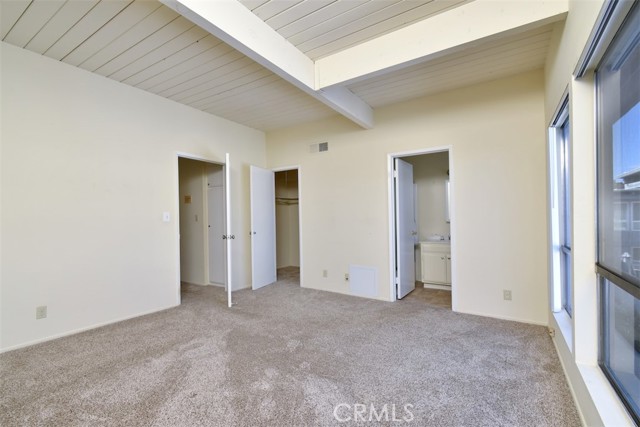 The main level features a large living and dining area with room to spread out, along with a convenient powder room for guests — ideal for everyday living and entertaining. An attached patio offers additional space to potentially BBQ or just to enjoy a nice breeze. Upstairs, both bedrooms are generously sized with beamed ceilings and include oversized walk-in closets and private en-suite bathrooms, creating a functional dual-suite layout that works well for homeowners, roommates, or investors.