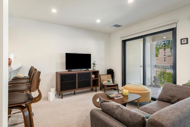 This stylish upstairs 1-bedroom, 1-bathroom condo is ideally situated in a prime Palm Springs location and offers the added benefit of a private balcony--with views of the pool, lush flowering gardens ..perfect for enjoying your morning coffee or relaxing in the evening desert air. Elevated for enhanced privacy, the unit features recessed lighting, roller shades, and plantation shutters, creating a bright yet inviting atmosphere.The open kitchen showcases white shaker cabinetry, quartz countertops, pull-up bar seating, and new stainless steel appliances, seamlessly connecting to the living space for effortless everyday living and entertaining. In-unit laundry adds everyday convenience.Located within the peaceful, gated community of Riviera Gardens, residents enjoy access to four pools and spas, beautifully maintained walking paths, and lush common areas. Just minutes from Palm Springs' renowned dining, shopping, and entertainment, this condo is ideal as a full-time residence, weekend retreat, or income-producing property. Don't miss one of the best values on the market in Palm Springs! FEE land ! HOA covers water, sewer, trash, landscaping, roof, and maintenance of the pool and grounds ...come see it !
