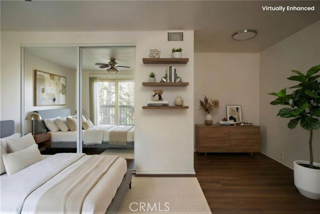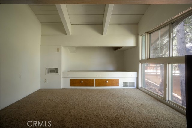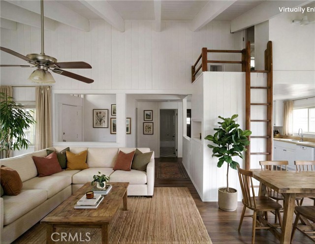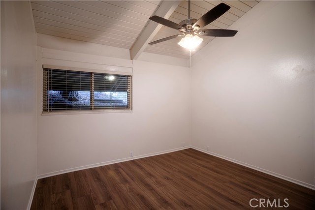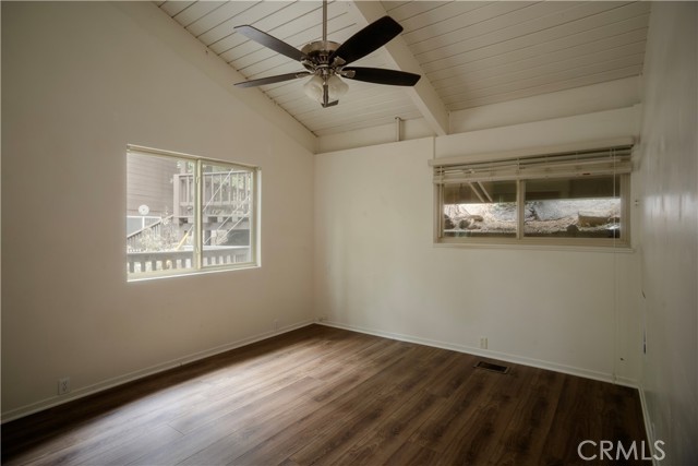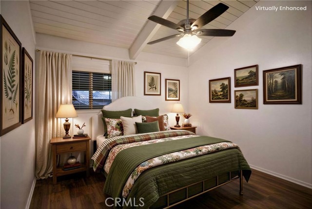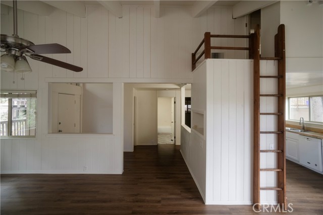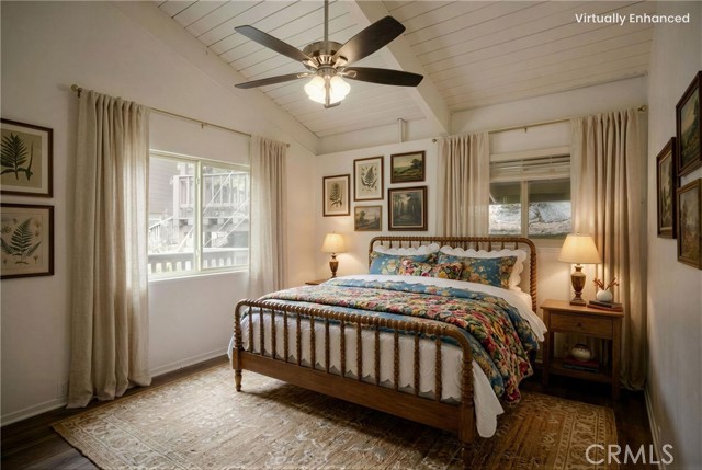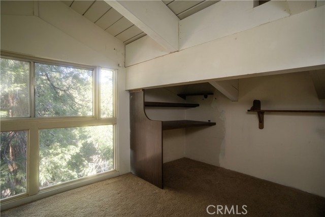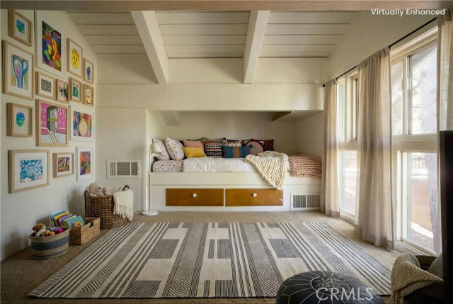 Two main-level bedrooms share a full bathroom, each enhanced by vaulted, open-beamed ceilings. A kid’s loft with a built-in desk and storage closet adds flexible space for study or play.