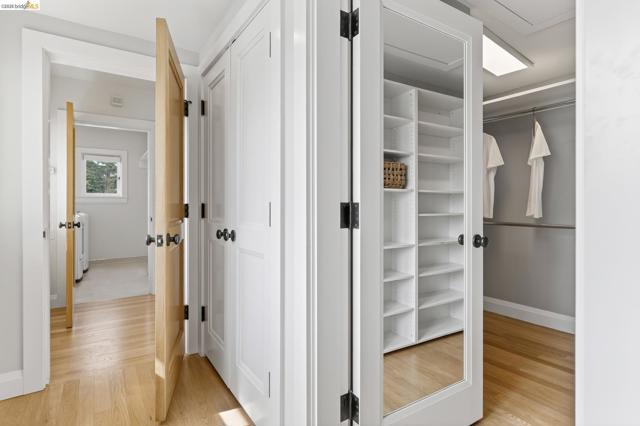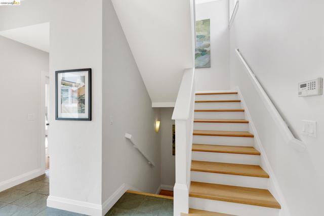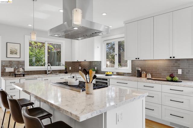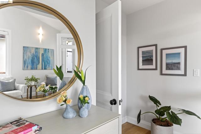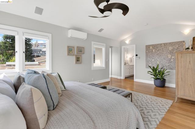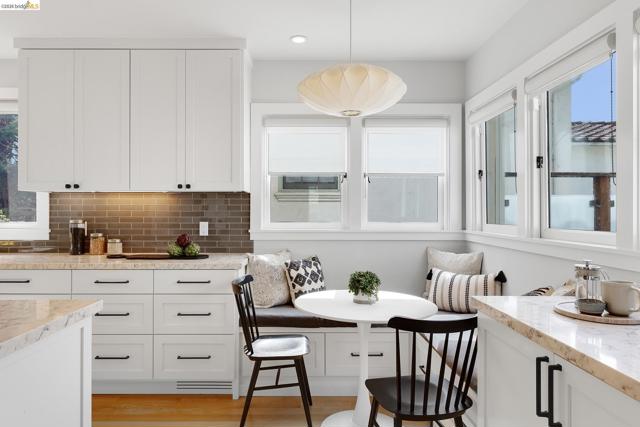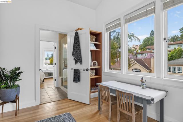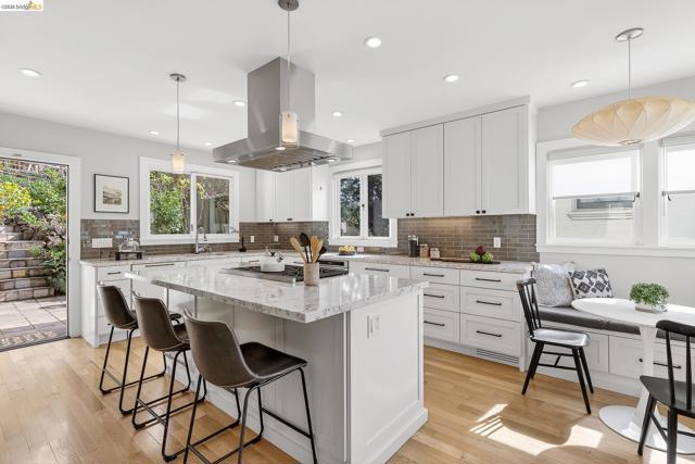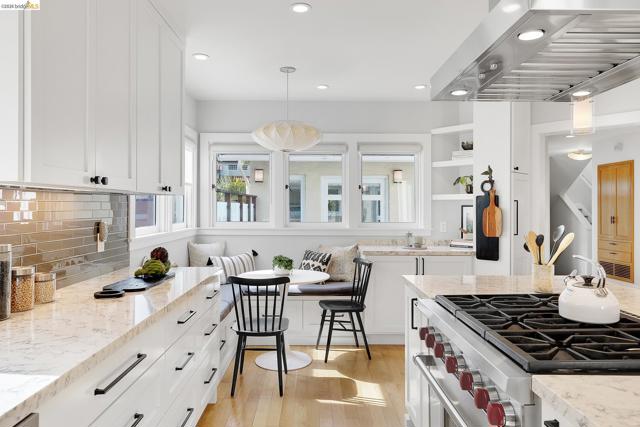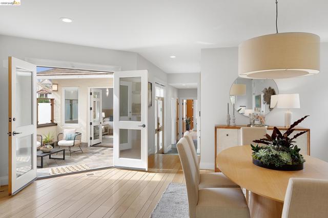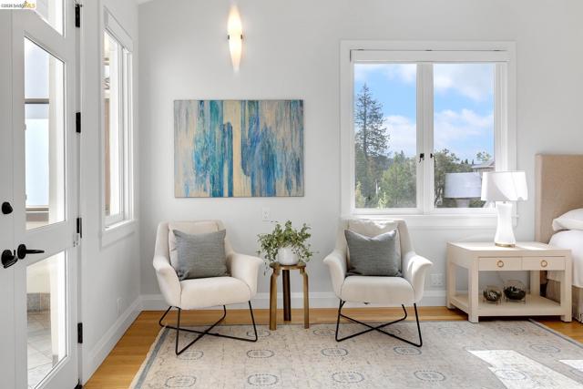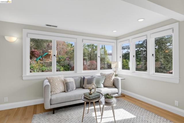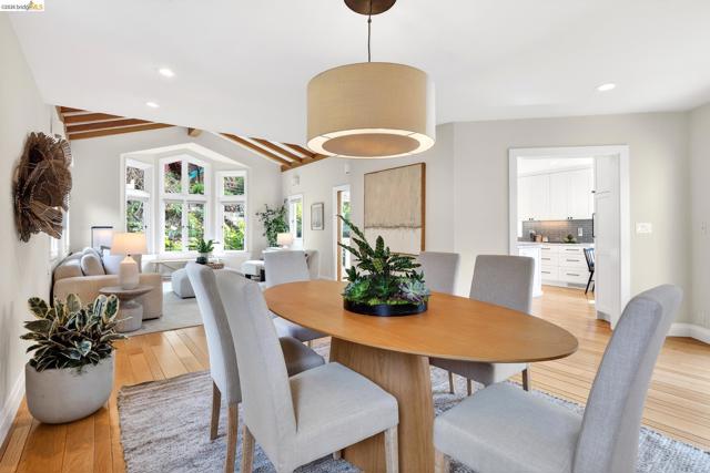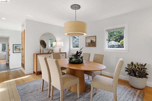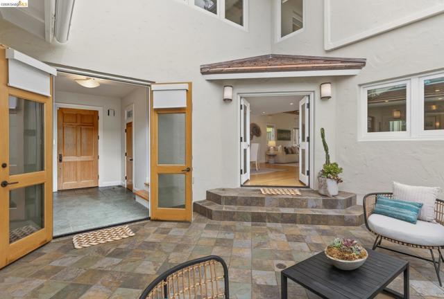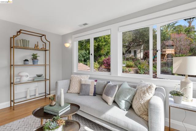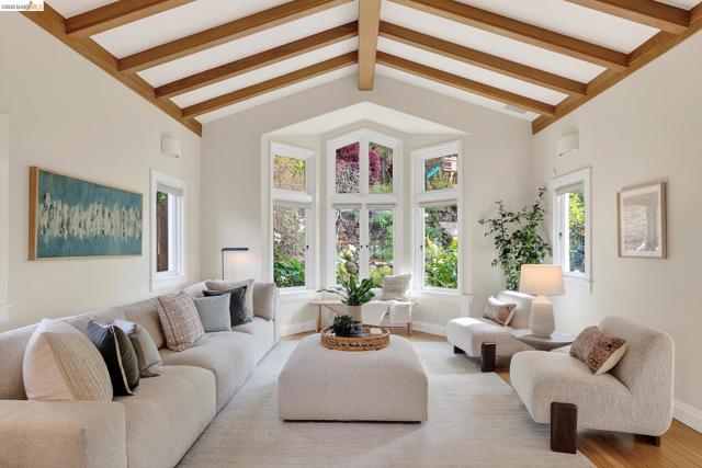 Designed to blur the line between indoors and out, the modern open floor plan creates an effortless setting for both lively entertaining and comfortable everyday life. Vaulted ceilings soar above sun-drenched interiors. Every room feels connected to the enchanting grounds. The spacious living room features a wall of windows framing lush greenery, while the adjoining dining room is ideal for festive gatherings. The eat-in kitchen, reimagined by a renowned local designer, enjoys a large island with counter seating, built-in breakfast nook, and stainless appliances including a 36" Wolf range and Sub Zero fridge. 2 bedrooms, shared bath and powder room complete the main level. Multiple French doors open to a private courtyard for dining, play, or relaxation. Upstairs, retreat to a luxurious primary suite with light-filled sitting room and spa-inspired bath offering heated floors, soaking tub and walk-in shower. The landscaped garden, featured in "The Beautiful Edible Garden", includes citrus, berries, succulents, a studio, and a 2-story playhouse. There's an attached 2-car garage with interior access, wine storage, and bonus space - your home gym awaits. The convenient location is just a few blocks to Village Market and Terrace Café and close to Rockridge shops, restaurants and BART.