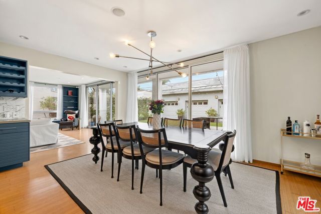 Floor-to-ceiling panes of glass, picture windows, rich wood panels, and smooth concrete converge to form the striking exterior of this recently remodeled and upgraded contemporary home, set back from the street with a brick-laid motor court and privacy hedges. The light-filled living room includes a ledgestone fireplace flanked by built-ins, walls of glass, and wood floors that flow throughout the entertaining spaces. In the sleek kosher kitchen, discover open shelving, wine storage and refrigerator, two dishwashers, double oven with warming drawer, ample cabinetry, pantry, granite countertops, and large center island with breakfast bar seating and cooktop with hood. The dining room faces sliding glass that opens to the rear deck for and indoor-outdoor dining experience. Ascend the stairs in the open foyer to a brilliant landing with massive window display showcasing treetops and blue skies. The primary suite is spacious, complete with fireplace, built-ins, balcony access, and en-suite bath with separate tub and rainwater shower plus a dual-sink vanity. A custom walk-in closet includes ample storage and a large dresser island. Secondary bedrooms also feature built-ins plus an abundance of space, and the mahogany-clad office is perfect for study, work, and play. In the backyard, dine al-fresco, enjoy the brand-new organic pet-safe grassy turf yard, or utilize the three-car garage as a gym, dance studio, artist's haven, yoga, meditation, and more. This excellent neighborhood is central to the iconic Melrose Arts District with its trendy fashion boutiques and The Grove, right by Erewhon and moments to the nightlife, entertainment, shopping, and fine dining of West Hollywood, Larchmont Village, Beverly Hills, and the Westside.