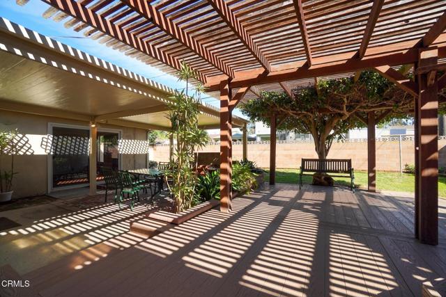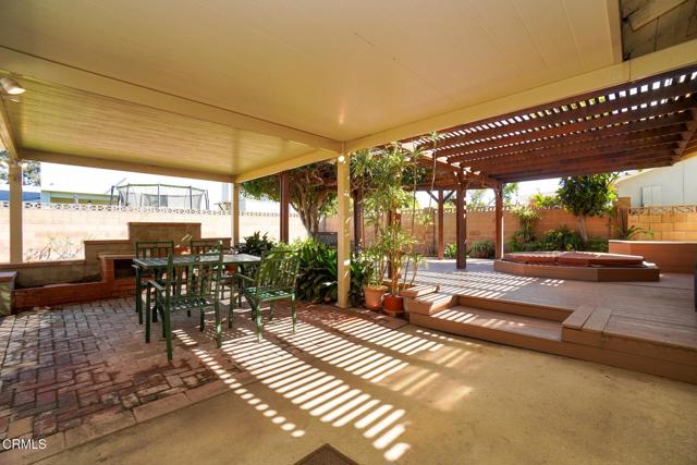 Great opportunity on this 3 bedroom, 2 bathroom with den, single story home for sale with an extended pebble stone driveway, beautiful brick accents, mature landscape and an attached 2 car garage. Front entry leads in to the open living room with recessed lighting and large windows with plantation shutters providing great natural lighting. Around the corner is the dining area which opens into the grandiose family room featuring a vaulted ceiling with exposed wood beams, an alluring wooden chandelier, a fireplace with brick accents and wooden mantel, a bar area, and inviting backyard views. The kitchen includes nice cabinetry, Quartz countertops, decorative tile backsplash, white appliances and tile flooring. The sizable adjacent den or bonus room provides views and access to the backyard.Down the hall is the main bedroom with dual closets, a bathroom with a tile surround bathtub and bay window, two secondary bedrooms, and a bathroom with walk-in tiled shower stall. The spacious backyard features a large covered patio area with brick pavers and accents, a huge raised deck area with a hot tub and covered trellis area, mature landscaping and surrounding brick walls. Home is a short drive to shopping, nearby beaches and Channel Island Harbor.