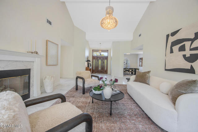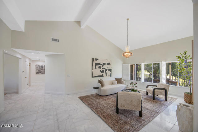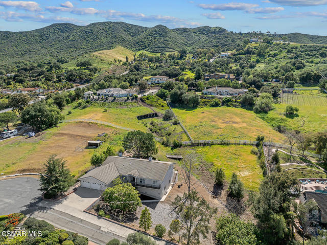 This ONE-STORY custom estate has VIEWS so spectacular they look like a painting. Sitting on a ONE ACRE lot with stunning pastoral and mountain views from almost every room, this one-of-a-kind home is beautiful, unique and private. Enter the spacious living room with soaring vaulted ceilings, a cozy fireplace, and a wall of windows looking right out onto those panoramic views. Enjoy your coffee in the morning or a glass of wine at sunset out on the wrap-around deck while you take in the views of the pastures, mature trees, lush landscaping, and even a charming bridge and a creek that runs through the backyard. This yard is so large there is room for up to two horses, a barn, a large pool, and/or an ADU. Plus, below the one-story home there is a HUGE 500 sq ft BONUS ROOM with a separate entrance. This bonus space has endless possibilities such as a guest room, office, art or music studio, or an ADU (granny flat). As an additional bonus, under the home there is also a huge additional enclosed storage area, and plenty of room for additions.The main home features beautiful real Carrara marble floors throughout, new designer lighting, and plantation shutters. Enjoy cooking in the large gourmet kitchen with a huge island, tons of cabinets, and granite countertops that are gorgeous and still contemporary. The kitchen opens to the sizeable great room with a fireplace, eating area, groovy bar for entertaining, and a door out to the patio looking out to the most beautiful scenes. The primary bedroom is a peaceful retreat complete with high ceilings, spectacular views, his and herswalk-in closets, and a large en-suite bathroom with dual vanities, stall shower, and a soaking tub. Generously sized secondary bedrooms are complemented by two additional bathrooms, offering comfort and flexibility for family and guestsalike. The brand-new wraparound deck/porch provides the perfect setting to take in the spectacular scenery of the surrounding mountains and evening lights, while an outdoor pergola with electricity creates an ideal space for relaxing, or hosting. This home also has a HUGE storage space underneath the home, and a new security system. With its unparalleled views, usable acreage, and seamless indoor-outdoor flow, this one-of-a-kind property delivers privacy, beauty, and exceptional versatility in a truly unforgettable setting.