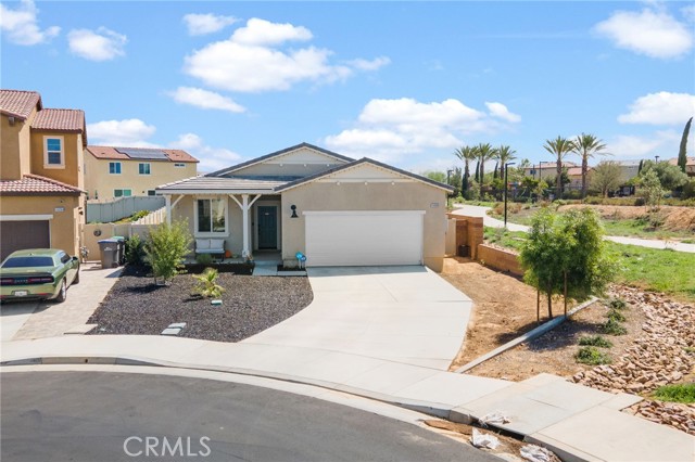 Welcome to this former Model home with plenty of upgrades, inside and out. Situated at the end of a Cul-de-sac. Large open concept kitchen with functioning island, White, shaker-style cabinets and a spacious pantry. Opens into a huge space that flows to the dining and the great room- sure to be the heart of the home. Natural light floods the room making this open floor plan feel bright and airy. Back yard has a covered Patio on large slab and organic garden. Solar panels are on a lease.
