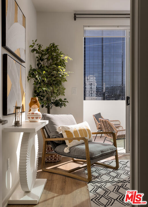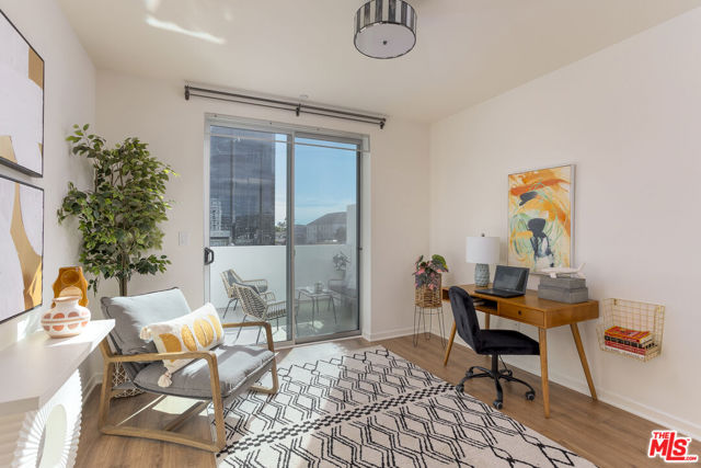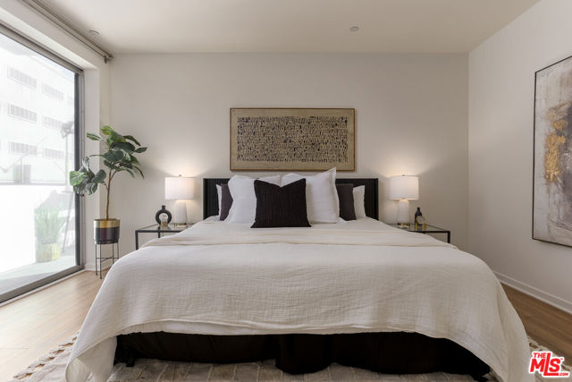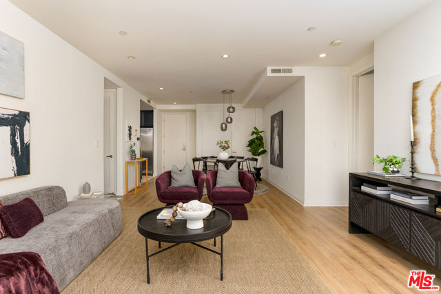 Gorgeous contemporary Miracle Mile condo located on one of LA's most iconic corners. Fairfax and Wilshire, across from LA's "Museum Row" which includes the LACMA, the Academy Museum, Petersen Automotive Museum, "The David Geffen Galleries", and the new Fairfax and Wilshire metro stop. The Grove and 3rd Street dining and shopping are only a few blocks away. The building was recently renovated, and the unit itself flows wonderfully and offers a spacious living and dining area. It is the only unit in the building with an enormous wrap-around balcony, with entrances from every room. Enjoy your morning coffee or a California sunset from your private outdoor living lounge. This 2-bedroom, 2-bath unit has been thoughtfully updated with new LVP floors, upgraded appliances, and fresh designer paint throughout. The primary bedroom offers a generous walk-in closet and an opulent en-suite bathroom with a marble bath/shower. The 2nd bedroom and bath are located on the opposite side of the unit, giving your guests optimal privacy. There is also a stacked washer and dryer in the unit, double-pane windows and doors, and two secure tandem parking spaces. The building has a rooftop deck with BBQ and 365-degree views of the city. Other amenities include a Butterfly MX access system, an EV charging station, and an Amazon locker for packages. Don't miss this one, will NOT last!