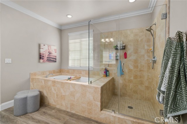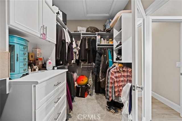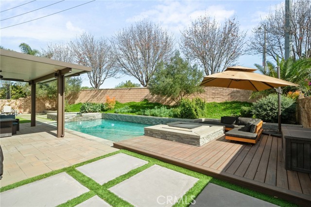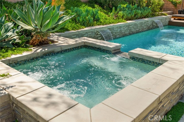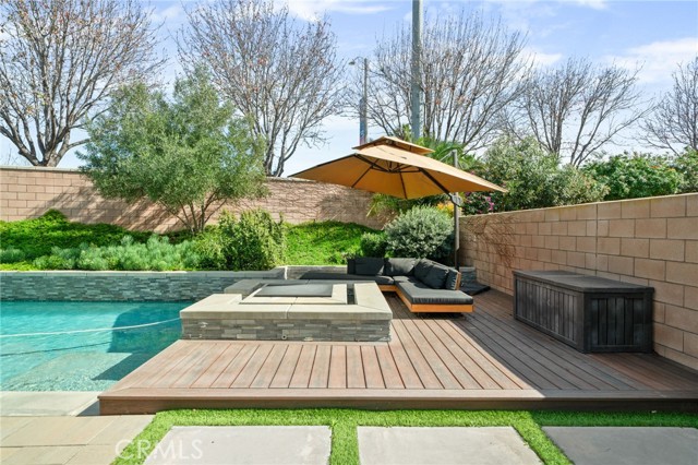 The expansive primary suite is your private retreat, offering direct access to the backyard sanctuary. Enjoy a custom closet system and a spa-like atmosphere that continues outdoors. Designed for relaxation and entertainment alike, the backyard boasts low-maintenance turf, a dog run, vibrant garden beds, and a sparkling pool and spa with cascading waterfalls—all framed by lush, mature landscaping.