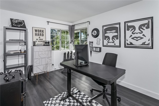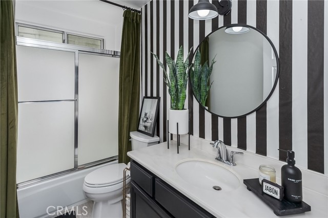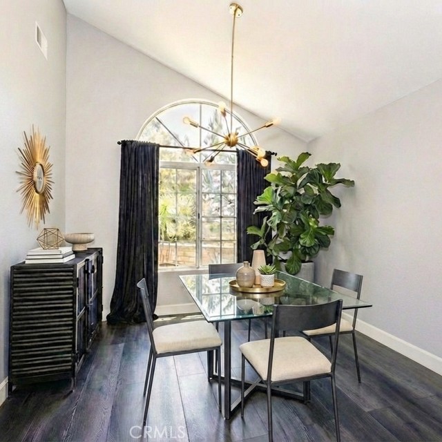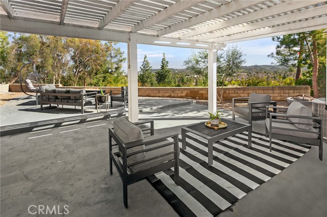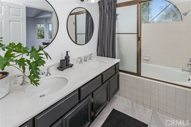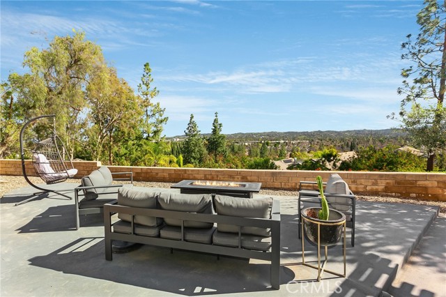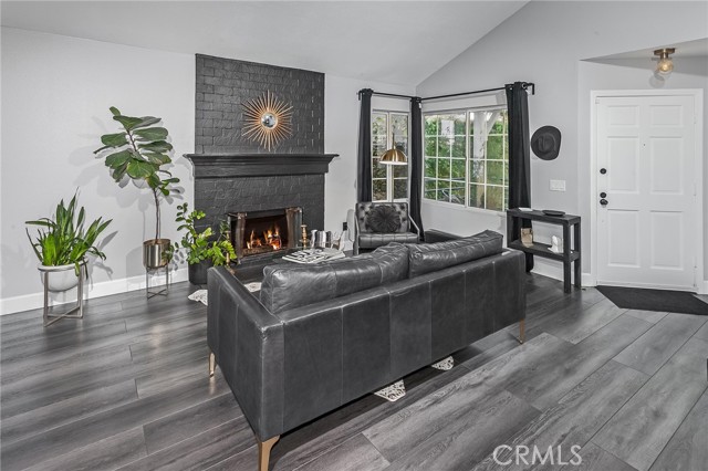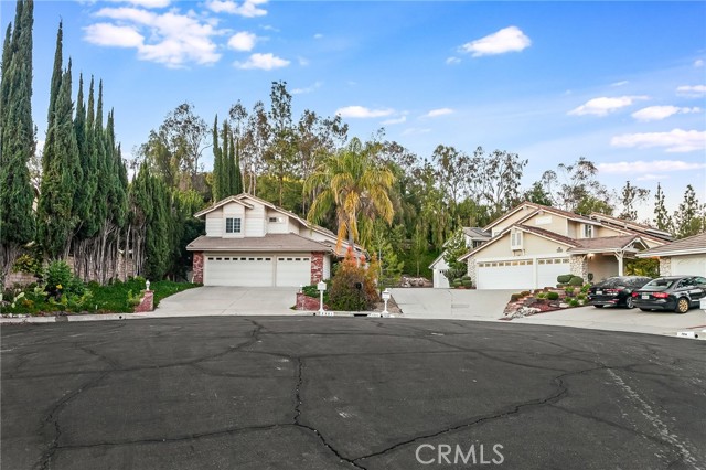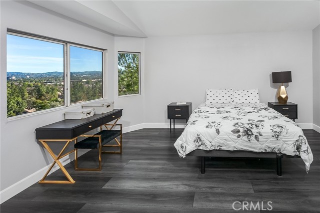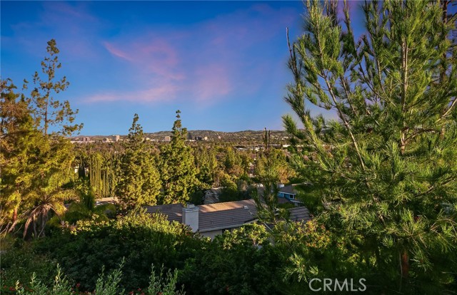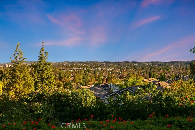 Tucked away at the end of a quiet cul-de-sac, this beautifully maintained two-story residence offers 1,815 square feet of thoughtfully designed living space with soaring ceilings, expansive windows, and breathtaking panoramic views. The architectural volume creates an open, airy feel filled with natural light. A welcoming front porch leads into a dramatic living room with vaulted ceilings and a floor-to-ceiling black brick fireplace with mantle. Walls of windows invite in light, while luxury vinyl flooring adds warmth and continuity, ideal for everyday living and entertaining. The kitchen blends style and function with recessed lighting, a modern fixture, freshly painted cabinetry with updated hardware, newer tile flooring, and tile countertops. A garden window brightens the space, and newer appliances include a 5-burner gas range, dishwasher, microwave, and new garbage disposal. A breakfast bar and sunny nook offer casual dining, while the formal dining room features a picture window, contemporary chandelier, and matching luxury vinyl floors. The remodeled powder room showcases a custom basin, new tile walls and floors, and statement lighting. An indoor laundry room with built-in storage adds convenience. Upstairs, the primary suite captures sweeping city light and valley views, enhanced by pitched ceilings and expansive windows. A walk-in closet provides generous storage, and the en suite bath features a dual basin ebony vanity, chic mirrors, tile flooring, and a tiled glass-enclosed tub and shower. Two additional bedrooms offer pitched ceilings, natural light, and ample closets. The full guest bath includes an ebony vanity, tile flooring, and a tiled glass-enclosed tub and shower. The hillside setting maximizes unobstructed panoramic views with spectacular sunrises, sunsets, and annual fireworks. A covered concrete patio and open patio create inviting outdoor living spaces. Low-maintenance grounds include newer coated concrete for durability and appeal. Ideally located near top-rated public, private, and charter schools, and minutes from premier shopping, dining, and entertainment, this home offers the perfect balance of tranquility, design, and convenience. Ideally situated near highly regarded public, private, and charter schools, and just moments from Westfield Topanga, The Village outdoor mall, acclaimed dining, world-class shopping, and the new Rams facility.