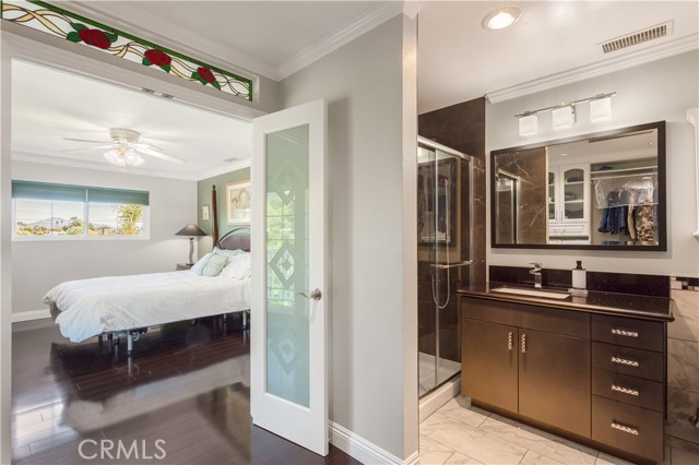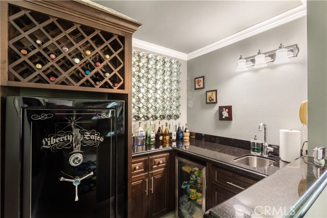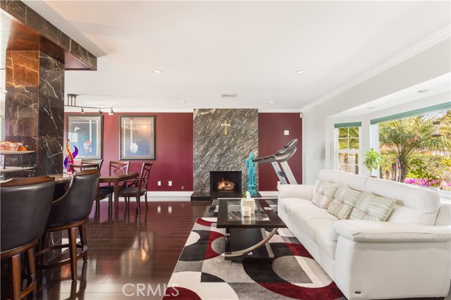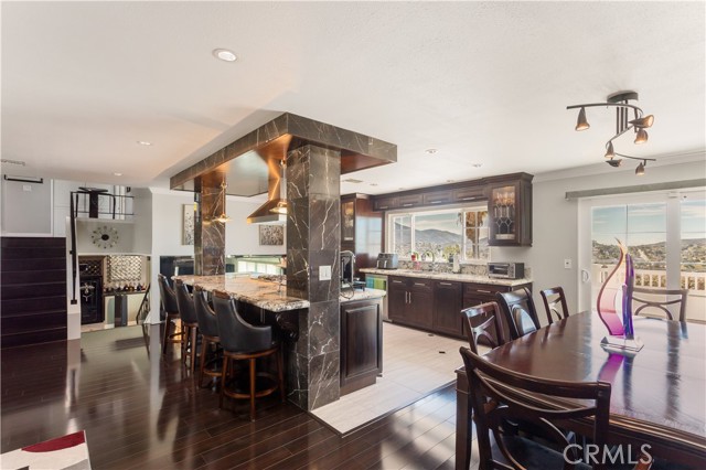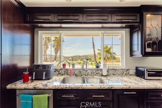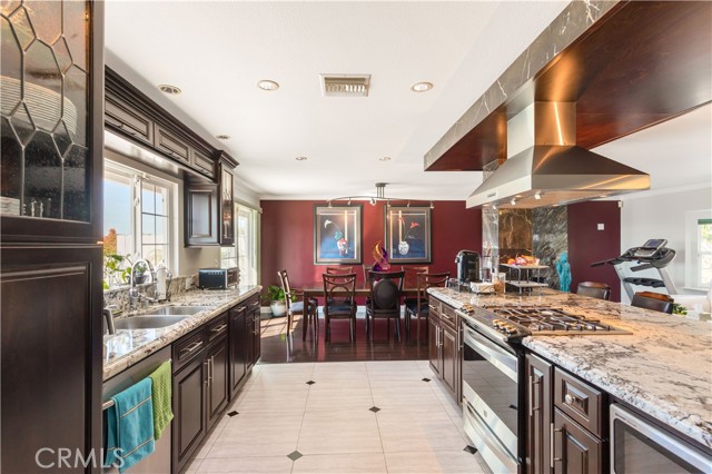 Inside, luxury is expressed through carefully curated, cohesive finishes. Custom-selected quartz/granite countertops flow seamlessly from the kitchen to the bathrooms and downstairs wet bar, rich engineered wood flooring, and striking 24-inch ceramic tile. The chef’s kitchen features a massive island with marble columns, positioned to capture hillside views, custom extra-deep dark coffee-stained cherry cabinetry with soft-close drawers and pull-outs, and desirable stainless steel appliances — combining functionality with sophisticated style.