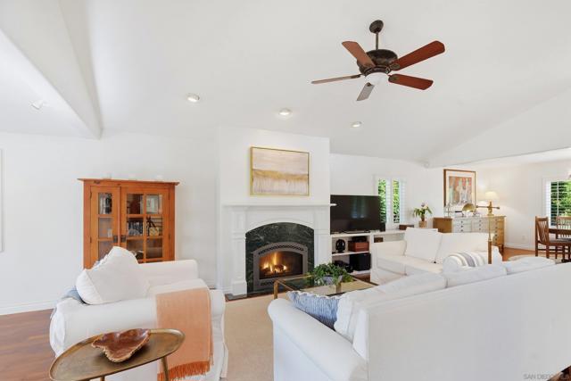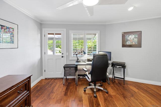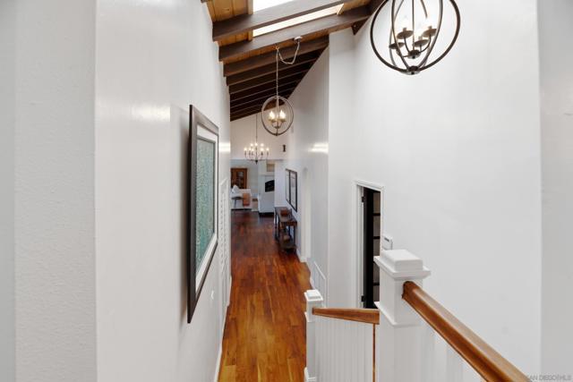 Nestled in a charming Spanish-style split-level home, featuring a downstairs granny-flat/game room with full bath and private entrance, owned solar system (40 panels), and pool/spa/private yard, this beautifully upgraded residence situated on a private lot, blends warmth, functionality, and timeless design. Featuring real Brazilian hardwood floors, solid core wood doors, crown molding throughout the living areas, hallways, and all bedrooms. Open-beamed ceiling in the main entryway, the craftsmanship and attention to detail are immediately evident throughout this home. The remodeled kitchen is designed for both everyday living and entertaining, complete with double Bosch ovens, a Thermidor stovetop, Bosch dishwasher, and KitchenAid refrigerator. Dual-paned windows and skylights in the kitchen. The home offers a spacious breakfast area, formal living room, and separate family room, providing versatile gathering spaces. An office and powder room are conveniently located on the main level. Upstairs, you’ll find three bedrooms, including a serene primary suite with crown molding, plantation shutters, western-facing views, and a custom California Closet in the primary bathroom. The spa-inspired bath features dual vanities, a soaking tub, and a separate shower. Dual-zoned AC and heating provide year-round comfort. Downstairs includes an additional living area with it's own private entrance complete with its own full bathroom, ideal for extended family or guests. Outdoor amenities are equally impressive with potential RV parking, a tranquil waterfall feature poolside, mature fruit trees including apple, peach, plum, avocado, lemon, orange, and assorted citrus, plus a chicken coop/dog run. The property also offers direct access to the bridle trail and Silver Saddle access point from the backyard, perfect for equestrian or outdoor enthusiasts. This home truly combines Spanish charm, thoughtful upgrades, and flexible living in the highly desirable Silver Saddle/Green Valley neighborhood of Poway and close to top-rated schools.