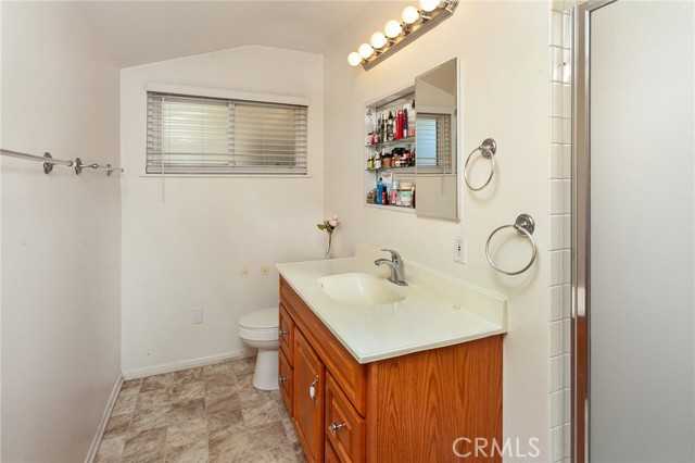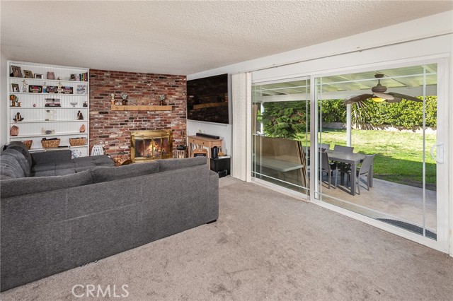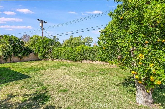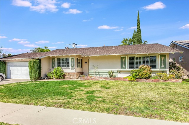 Located on a quiet street in Canoga Park, this inviting 3-bedroom, 2-bathroom home offers 1,316 square feet of comfortable living space on an expansive 7,445 square foot lot. The home greets you with attractive curb appeal featuring a manicured front lawn, colorful raised brick planters, trimmed hedges, and a covered entry. Updated mullioned windows enhance the exterior character while bringing in beautiful natural light. Inside, the family room is warm and welcoming with a dramatic floor to ceiling brick fireplace, built in bookshelves, carpeting, and a sliding glass door that opens to the backyard, creating a seamless connection to outdoor living. The kitchen is bright and well organized with white tile countertops, a full tile backsplash, and wood cabinetry that extends to the ceiling for abundant storage. A built-in oven, microwave, gas cooktop, and dishwasher provide everyday convenience. The dual basin sink sits beneath a window overlooking the yard. The adjoining dining room features two large windows, recessed lighting, and vinyl flooring, offering a comfortable space for both casual meals and gatherings. The primary bedroom includes plantation shutters, multiple windows, carpeting, and a lighted ceiling fan. The en suite bathroom is thoughtfully designed with a single basin vanity, medicine cabinet, privacy window, Hollywood style lighting, and a glass enclosed tiled step in shower. Two additional bedrooms are bright and airy with generous closet space. The guest bathroom features a single vanity, framed dressing mirror, separate medicine cabinet, wainscoting detail, and a tiled tub and shower combination. The backyard is a standout feature, offering a spacious and private setting with a lush green lawn, mature trees including citrus, abundant shrubbery, and colorful raised flowerbeds. A covered patio with a lighted ceiling fan creates an ideal space for relaxing or entertaining. Additional highlights include central air and heat, copper plumbing, and a two-car direct access garage complete with a workbench. Moments away from restaurants, shopping and parks.