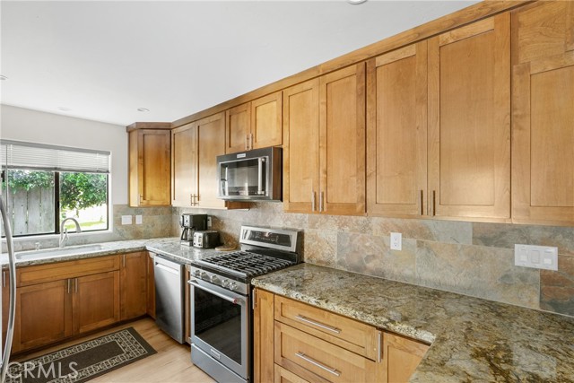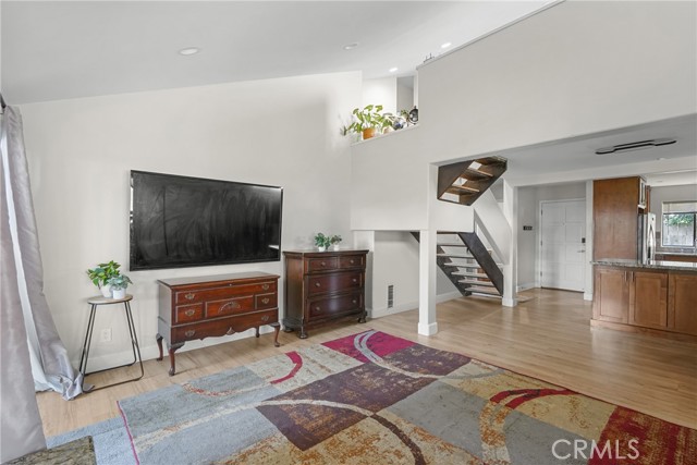 Inside, an open layout connects the main living spaces. The living room features high ceilings, laminate flooring, a fireplace, and direct access to the backyard, creating a comfortable setting for both relaxing and entertaining. The adjacent kitchen is equipped with granite countertops, stainless steel appliances, a center island, and ample cabinet storage, offering a clean and functional space for daily living. A convenient half bath is located on the main floor, which provides added comfort for guests.