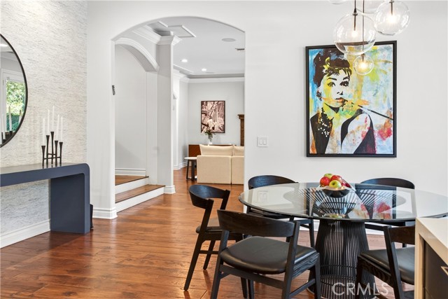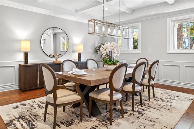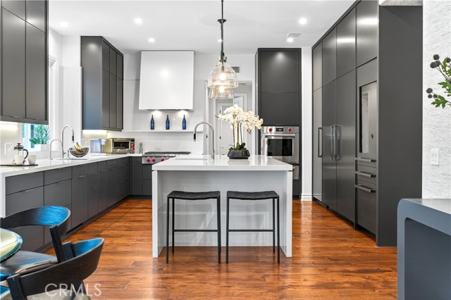 Inside, a grand double-door entry and sweeping staircase introduce light-filled interiors with high ceilings and rich engineered hardwood floors. The kitchen—renovated by an international designer—showcases beautifully detailed custom cabinetry, a striking waterfall island, sleek quartz counters, Sub-Zero and Wolf appliances, and a built-in wine fridge with beverage drawers. The formal dining room displays elegant wainscoting and coffered ceilings, while the living room features refined built-ins and French doors that open to the backyard.