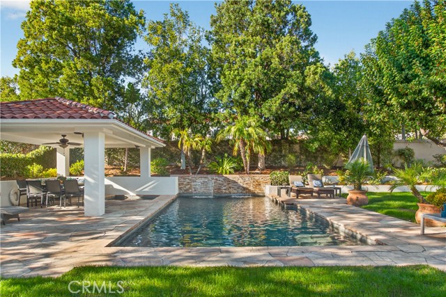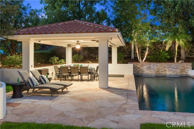 Tucked at the end of a quiet cul-de-sac in prestigious Mountain View Estates, this custom home offers exceptional privacy and one of the community’s most impressive backyards. Designed for entertaining, the private, estate-style grounds feature a large sparkling pool with tranquil waterfall, spacious sports court, covered pavilion with built-in cooling misters, relaxing hot tub, fire pit lounge, and an outdoor sound system—all shaded by mature trees and surrounded by lush landscaping.