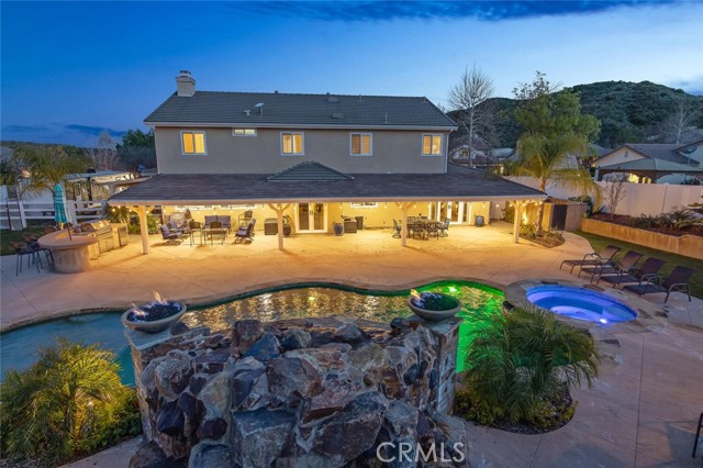 The highly esteemed Hasley Estates is known to Santa Clarita locals as one of the area's hidden gems! Just minutes to Valencia Town Center, this serene bedroom Community of A22 zoned horse property features sprawling estates on expansive lots with privacy, RV parking, ADU and workshop friendly living! 30177 Sagecrest Way boasts amenities the most discerning home buyers seek and more! Centered on a nearly 3/4 acre corner lot with privacy vinyl fencing, beautiful landscaping, breathtaking POOL with dramatic stone waterfall, resort like SPA, 4-CAR GARAGE, covered dog run, tons of grass area to enjoy, huge solid covered patio with wall mounted TV, built in BBQ, fruit trees, FULL SIZE GATED RV PARKING complete with 220v connections and sewer clean out! This is where serene neighborhood charm meets elevated resort-style living, all framed by exceptional curb appeal that reflects true pride of ownership. Step inside to discover timeless features such as wide plank flooring and custom stained hardwood finishes that emanate warmth and sophistication! The elegant and inviting formal living room flows seamlessly into the heart of the home, a beautifully designed chef’s kitchen complete with stunning granite countertops, convenient center island, upgraded stainless steel appliances, designer backsplash and custom built-in bar with wine fridge and refined finishes, creating the perfect setting for effortless entertaining while looking out to the stunning waterfall through dual french doors! The adjacent family room, adorned with lovely hearth and gas fireplace offers a comfortable gathering space for everyday living! The convenient indoor laundry is located on the main level along with a FULL DOWNSTAIRS BEDROOM And BATH ideal for guests or multigenerational living. Upstairs, 5 additional private bedrooms offer generous space, namely the expansive primary suite complete with walk-in closet with custom built ins and spa-like bathroom, seated vanity, soaking tub plus separate shower and overlooks tranquil hillside views! The 4 additional upstairs bedrooms offer 2 en suite bed/baths and 2 more share the lovely hall bath all with timeless finishes and upgraded flooring! This home also is energy efficient with solar panels! For those with an adventurous spirit, the property includes RV parking & abundant space for storing your boat, jet skis, or ATVs, perfect for weekends at nearby Castaic Lake or Pyramid Lake! This is a home & a lifestyle you will enjoy for years to come!