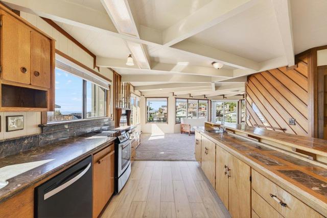 Perched on a hill above the sea in a quiet neighborhood where everyone wants to be!! Below you'll find the expansive beach that stretches for miles which can be accessed by the sweet community pathway leading to the shore. The thoughtfully configured home offers exceptional versatility with multiple living spaces designed to adapt to your needs. The upper primary living space features one bedroom one bath complete with a full kitchen, large pantry and a wood burning fireplace in the living area which leads to the wraparound deck where you can smell the ocean and hear the waves while you're enjoying the view. There's an additional entrance upstairs with it's own deck. Downstairs includes two bedrooms, full bathroom, laundry room plus a versatile studio space with an additional bonus room offering flexibility for multigenerational living. Warm Craftsman woodwork adds character and charm throughout the home!! A rare opportunity for those seeking serenity in the highly sought after Sunset Beach Community!!!