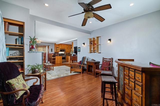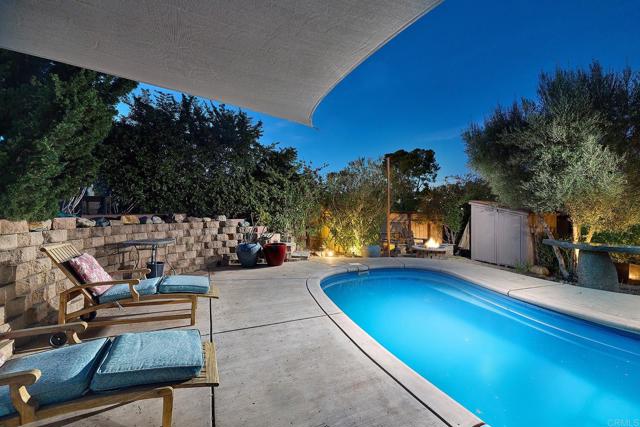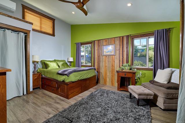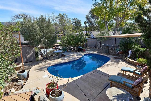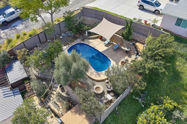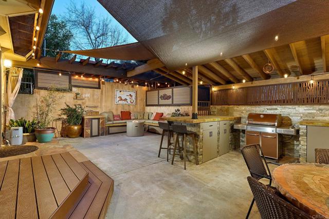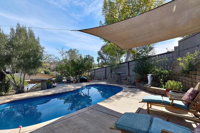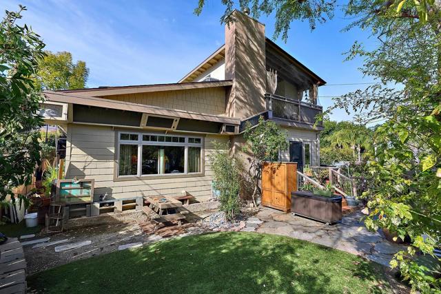 This beautifully appointed residence is truly a work of art. Recently renovated by a talented pair of artists, this 3-bedroom, 2.5-bathroom home offers approximately 1,553 square feet of thoughtfully curated living space — a rare and distinctive gem unlike anything else in Vista. Upstairs, the private primary retreat feels like a sanctuary, complete with its own kitchenette, ensuite bath, and balcony — an ideal escape to enjoy peaceful mornings or sunrise views. The main level exudes warmth and old-world charm with rich wood trim, composite hardwood flooring, and a romantic stone fireplace. The kitchen is both elegant and functional, featuring black soapstone countertops, high-quality hardwood cabinetry, a tiled backsplash, tiled floors, and top-of-the-line stainless steel appliances. A greenhouse window above the large dark stone sink provides the perfect space for fresh herbs or flowers. Two additional bedrooms are located downstairs. One includes a kitchenette and sliding doors that open to the backyard, offering flexibility for guests or extended living. The second features a Murphy bed (included). The shared bath is a work of art, showcasing a custom tile inlay of bamboo trees in the shower and a striking river rock backsplash behind an art glass vessel sink. A mudroom with a half bath and utility sink sits conveniently just off the kitchen. Every detail reflects the care of an experienced builder crafting a personal residence — from timed bathroom fans and automatic closet lighting to soft-close drawers and built-in organizers. Artistic accents such as the grand stairwell chandelier and wood paneling further elevate the home’s character. Step outside and experience quintessential San Diego indoor-outdoor living. The 77-square-foot covered patio creates an inviting outdoor oasis, complete with banquet seating and an outdoor kitchen area with space for a standard barbecue. A picturesque outdoor shower and terraced landscaping create multiple “outdoor rooms” throughout the yard. The hot tub is tucked beneath a covered patio for private relaxation, while the sparkling pool crowns the terraced hillside, accompanied by a fire pit, observation deck, gardens, and abundant fruit trees. Multiple outbuildings add exceptional versatility, including an artist’s studio, a wood shop (converted from a one-car garage), storage sheds, and a detached studio with rental potential. The detached studio features a faux fireplace electric heater, window AC unit, a generously sized bathroom with shower, and a kitchenette with cooktop, microwave, and refrigerator. The front yard is a gardener’s paradise, highlighted by a mature shade tree, an easy-care turf lawn, and a charming bridge leading to a native plant garden filled with bottlebrush, bamboo, and orange bell flowers. Raised garden beds along the side yard produce strawberries, corn, green beans, herbs, and tomatoes, while citrus (orange and lemon) and olive trees thrive near the pool. This is more than a home — it is a thoughtfully designed, artfully crafted retreat that embraces creativity, functionality, and the very best of San Diego living.