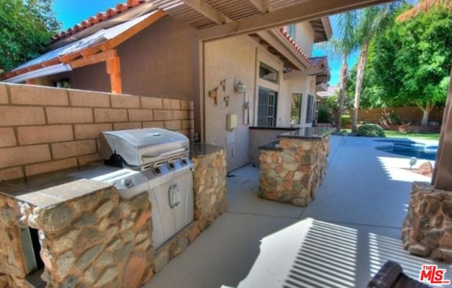 This resort-style home is situated on a large corner lot and has a circular driveway. The formal living room has a gorgeous stone fireplace. The living room, dining room, and family room offer views of the resort-style pool and spa. The large yard has covered and uncovered lounging areas, a granite bar that seats six people, and a built-in BBQ. The Extra Large Master Retreat has a stone fireplace, a private balcony with gorgeous mountain views, a large walk-in closet, a jacuzzi tub, a separate shower, double vanity sinks, and a bidet toilet. There are two additional bedrooms and two additional bathrooms upstairs. The fourth bedroom is on the main level and has a built-in office. The kitchen, half bathroom and laundry room is also located on the main level. Close to Championship golf courses and Indian Wells Tennis Garden. Broker Agent
