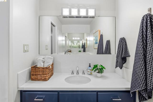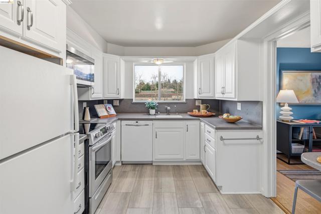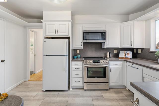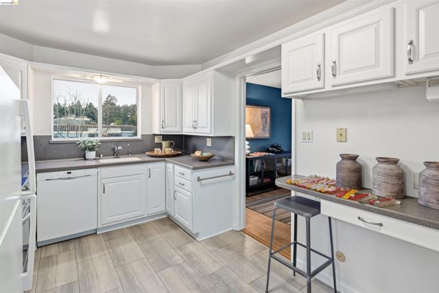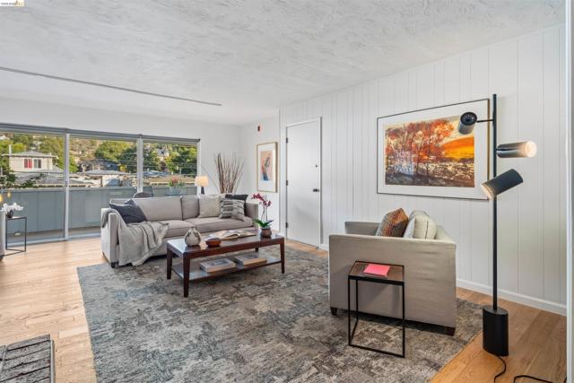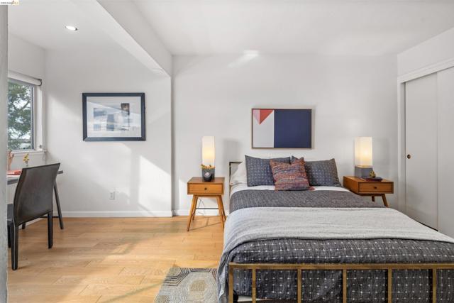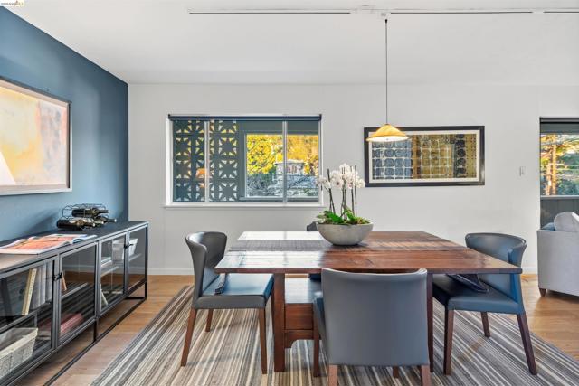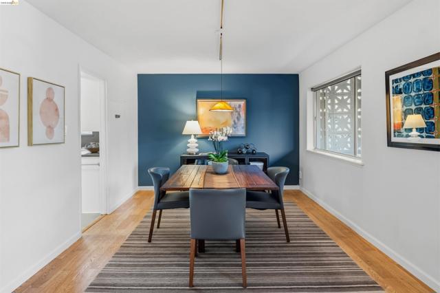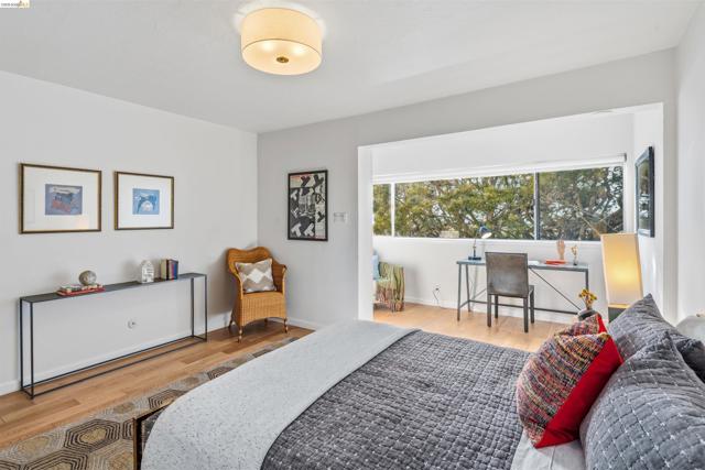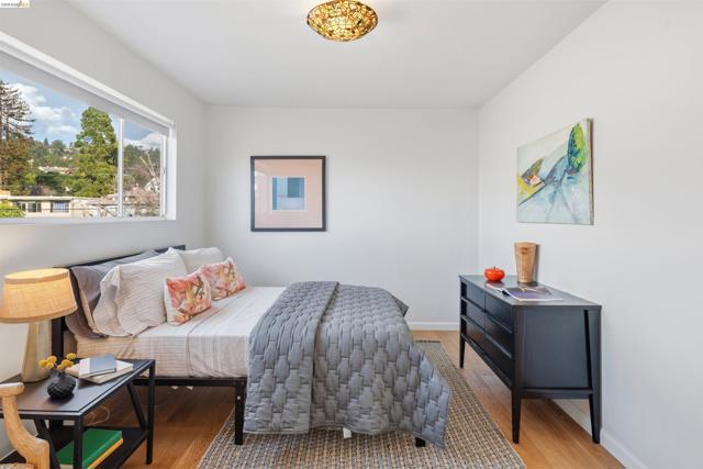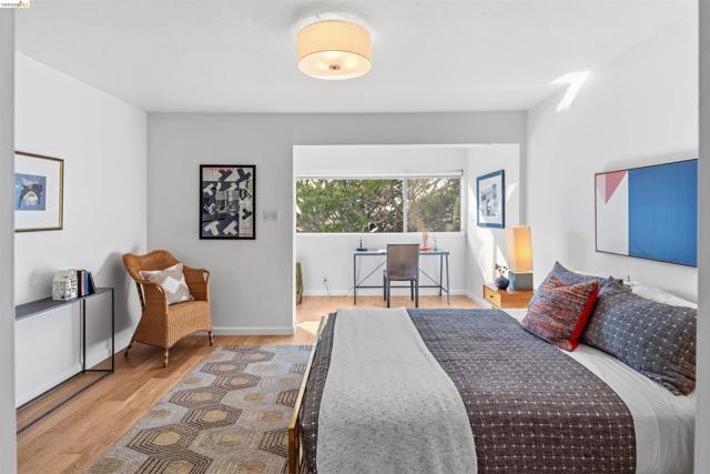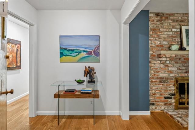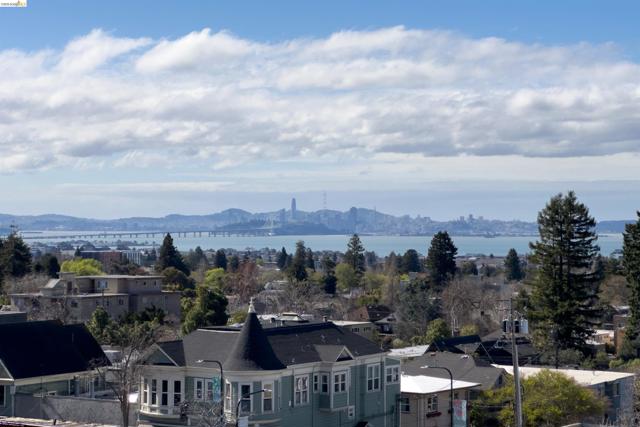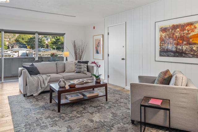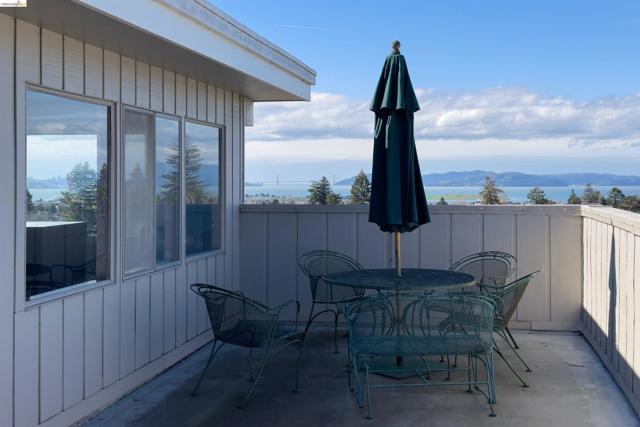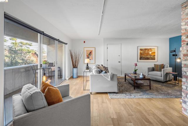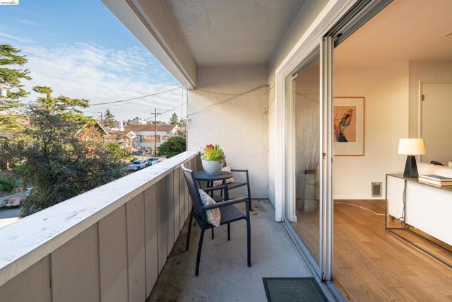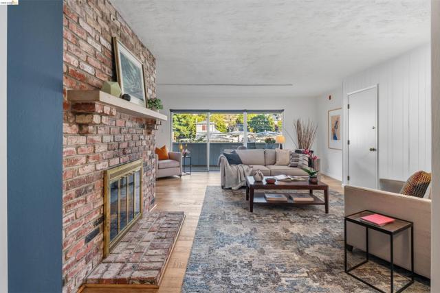Third-floor North Berkeley condo with mid-century character and real space to downsize or spread out. Elevator building with the most convenient location around the corner from Gourmet District restaurants and shopping. The living room is anchored by a full exposed brick fireplace and opens through sliding glass doors to a private covered balcony. Oak hardwood floors run throughout, and the building's original decorative breeze block screens add period detail and charm you rarely see anymore. The dining room accommodates a full-size table and connects to a kitchen with white cabinetry, stainless steel range, pantry, and breakfast bar. Down the hall, the oversized primary bedroom features a window nook perfect for a home office, with views stretching to the Bay. The second bedroom catches hill views and includes a wide closet. Building amenities include an elevator, shared rooftop deck with panoramic Bay and SF skyline views, on-site laundry, one deeded covered parking space, and private exterior storage. Whether you're scaling down or staking a claim in North Berkeley, this is the one that checks every box.