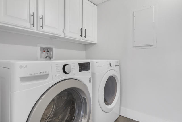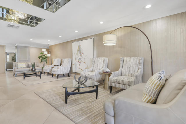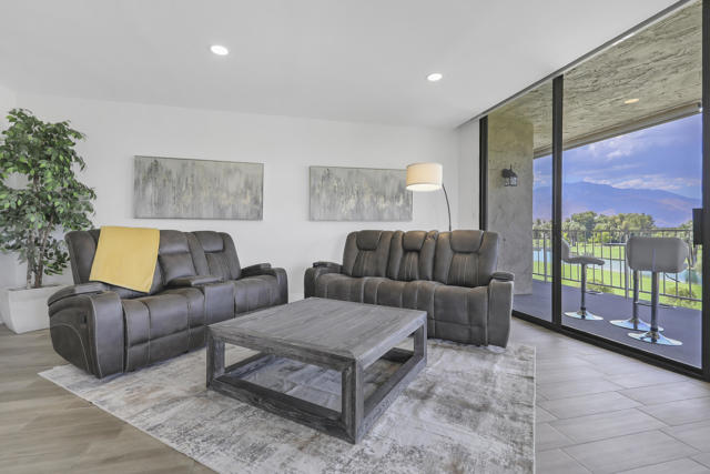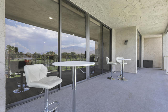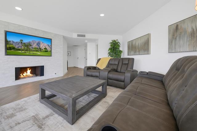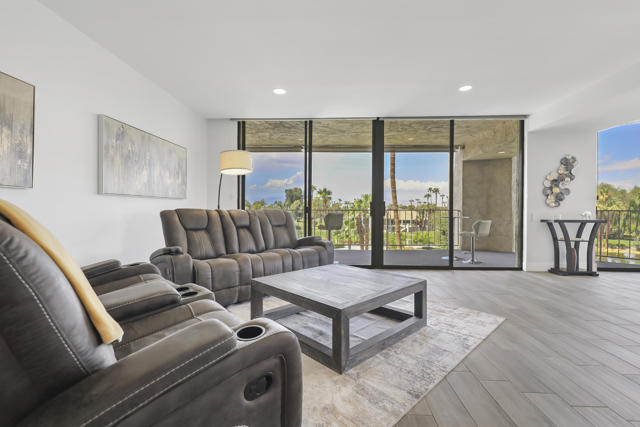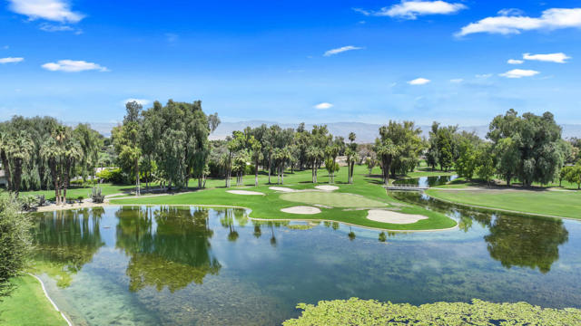 Experience elevated desert living in this beautifully reimagined Desert Island residence, offered furnished for immediate move-in ease! From the moment you step inside, walls of glass showcase stunning panoramic views of the lake, golf course, and surrounding mountains, creating a serene backdrop for everyday living. The open-concept great room is ideal for both relaxing and entertaining, complete with a sleek stacked-stone fireplace and a stylish bar. The chef's kitchen blends function and design with quartz waterfall countertops, stainless steel appliances, white shaker cabinetry, and designer backsplash. Both bathrooms have been thoughtfully updated with modern finishes, while the primary suite offers a spa-inspired retreat featuring quartz counters, soaking tub, and custom tile work. Extending the living space outdoors, a spacious balcony runs the full length of the home -- the perfect place to take in morning coffee or evening sunsets. Additional highlights include a tankless water heater and furnishings thoughtfully curated to complement the home's contemporary design. Set within the guard-gated Desert Island community, residents enjoy resort-style amenities and a true lock-and-leave lifestyle in the heart of Rancho Mirage. This home is move-in ready and waiting to be enjoyed!