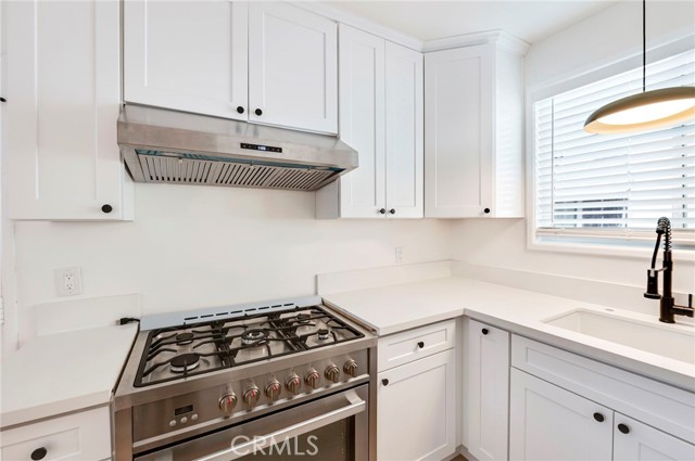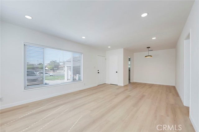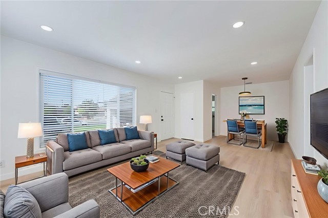 The spacious living room is perfect for gatherings and entertaining, complete with recessed lighting and an adjoining dining area. The thoughtfully updated kitchen showcases white shaker cabinetry, quartz countertops, coordinating hardware, a Fireclay sink, stainless steel five-burner gas range, garbage disposal, a cozy kitchen nook, and direct access to the attached two-car garage.