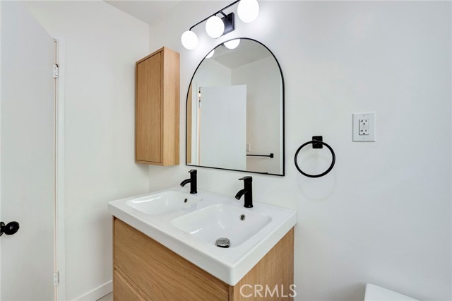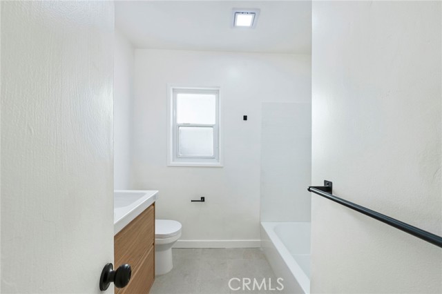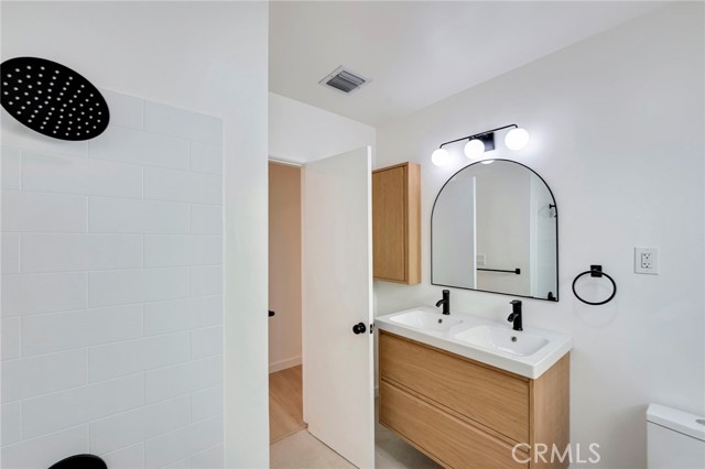 The bathroom has been tastefully reinvented with timeless materials and refined detailing, offering a functional and elevated aesthetic. Enhancements include a new bathtub with a sleek surround enclosure, contemporary hardware and fixtures for both the tub and the light oak floating double-sink vanity with matching storage along with soft-close hardware, modern LED lighting, mirror, and porcelain tile flooring.